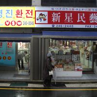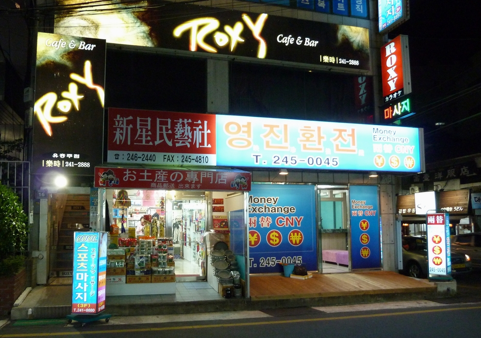 場所は、釜山観光ホテルの入口に向かって左に約70m位の所で、コンビニの前に有る新星民芸社(十字路角の土産屋さん:この店のお母さんが特に親切で、色々な情報を教えてくれます)のそばにある公認両替所です。名前は「映珍換銭」です。