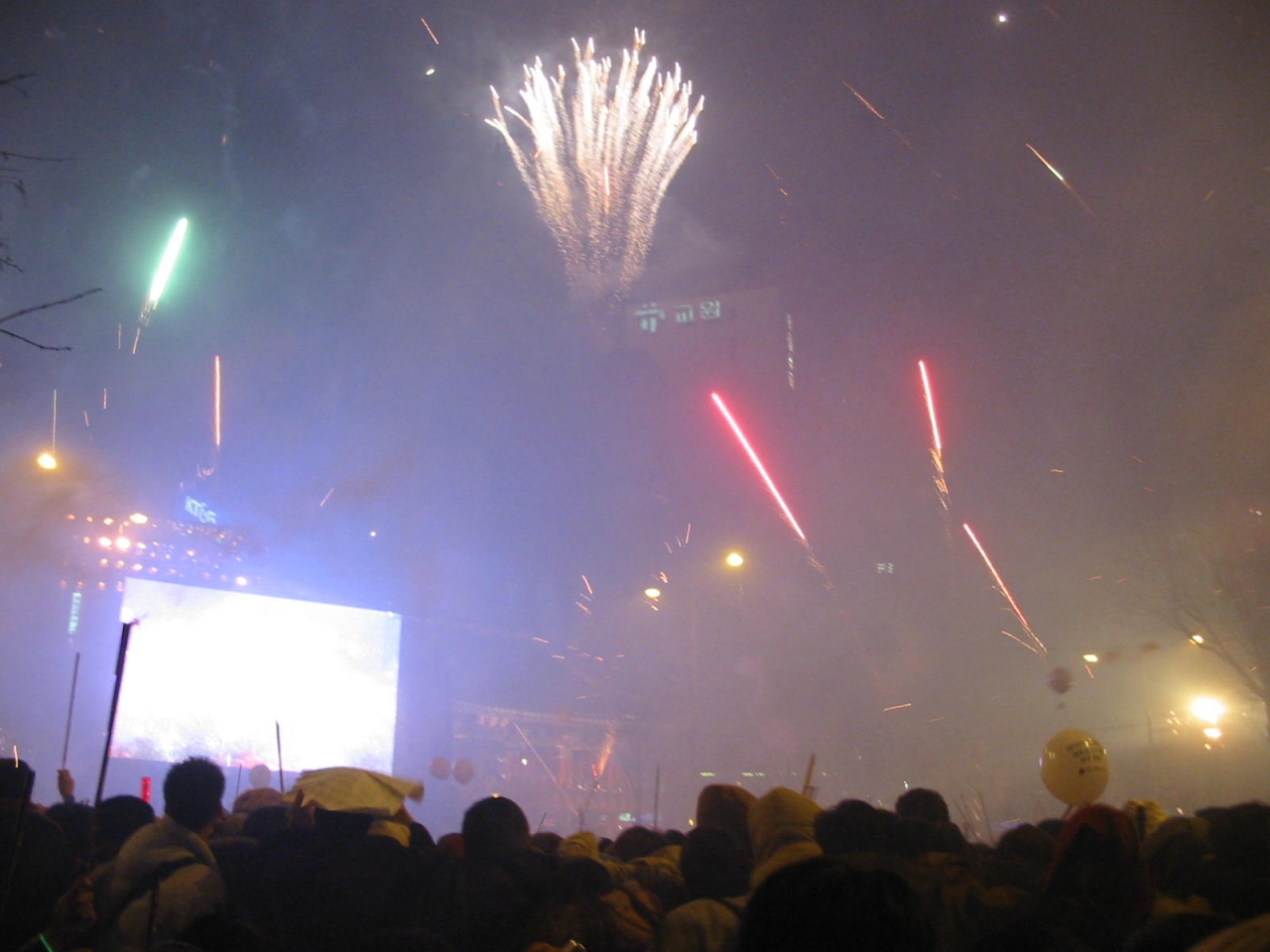 大晦日の夜10時すぎになると、特設ステージのある普信閣の周辺道路は歩行者天国となる。そこら中で市民らによって、ロケット花火が「これでもか」っていうぐらい打ち上げられており、非常に危険です。注意しようもないですが、火傷などに注意しましょう。 -