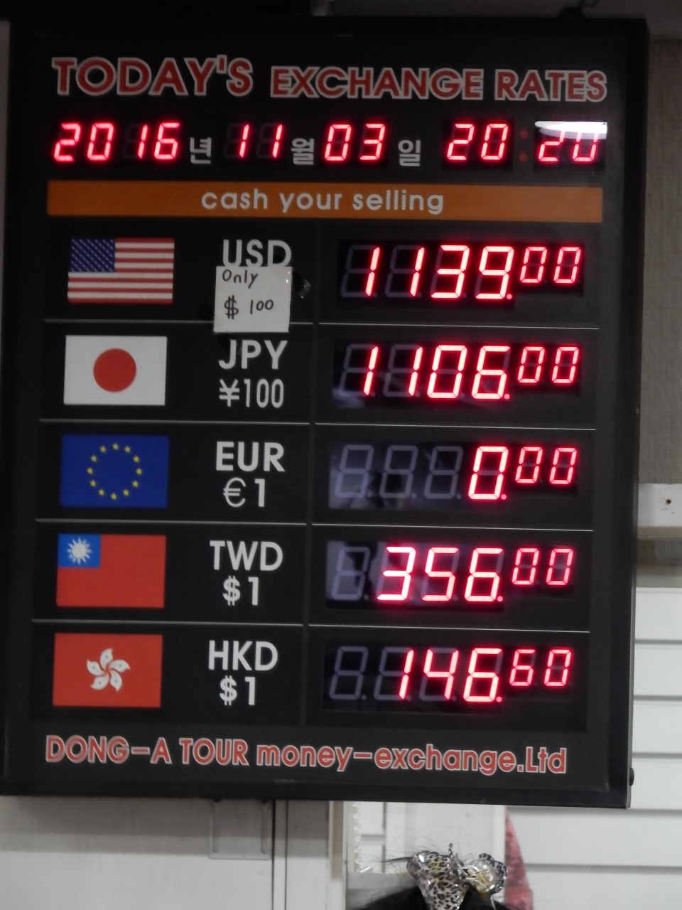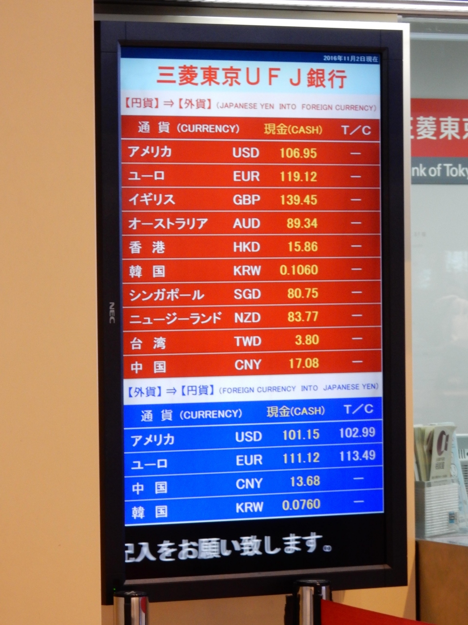 この日に釜山国際空港に着いたのですが、空港内銀行のレートを見て来なかったのですが、空港内銀行だと、多分97,000ウォン位にしかならないと思います。