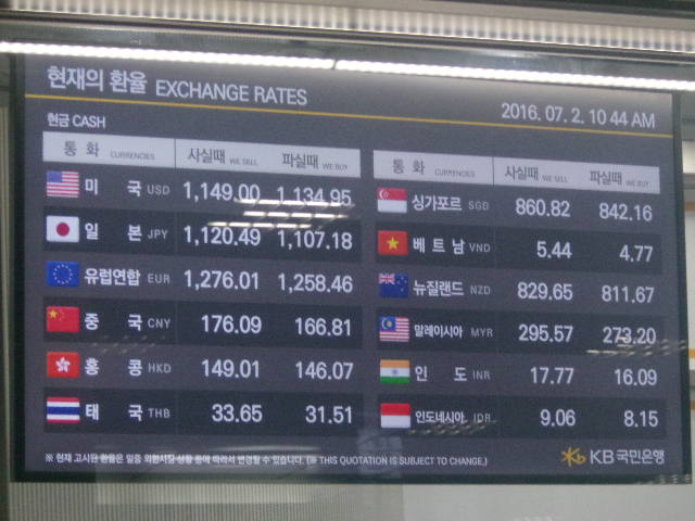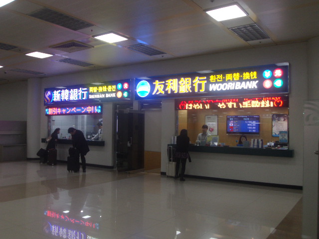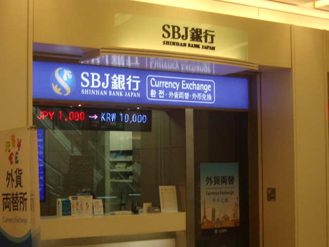 今回は羽田発着の金浦経由にてソウル入りしましたが、たまたま前日にHND内のSBJ(SHINHAN BANK JAPAN)銀行の両替レートを見ていたら、¥1,000=W10,000という、非常に計算しやすいレートだったので、額もそれ程大きくなかったので、ここで両替してみました。その次の日、金浦に到着後レートを確認したら、このレートより悪かったので、空港で両替、という意味では日本の空港で事前両替もありかな、と思いました。ただ、同じ日にソウル駅の所で銀行営業時間帯にレートを確認すると¥1,000=W10,300位だった(レート変動の可能性もありますが)ので、やはり銀行営業時間帯は、市内で両替した方がお得感は有るかと思います。