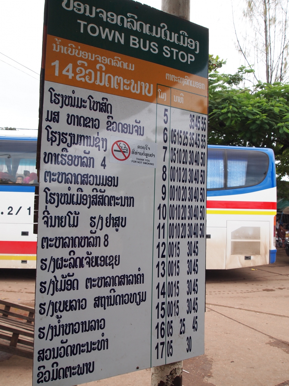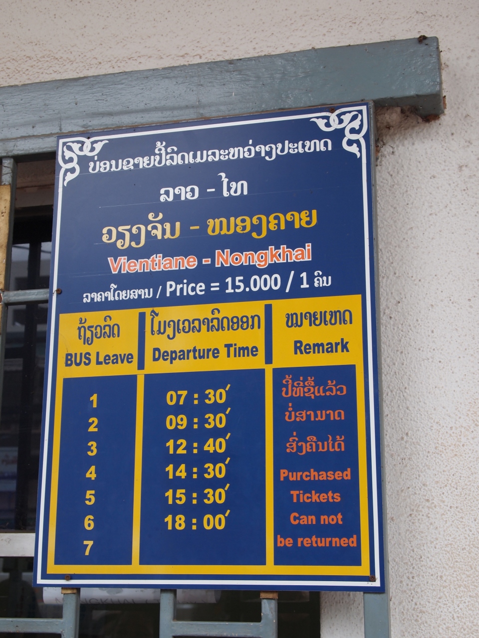 ビエンチャン中央バスターミナル(タラートサオ・バスターミナル)発ノーンカイ(タイ)行きバスの時刻表です。