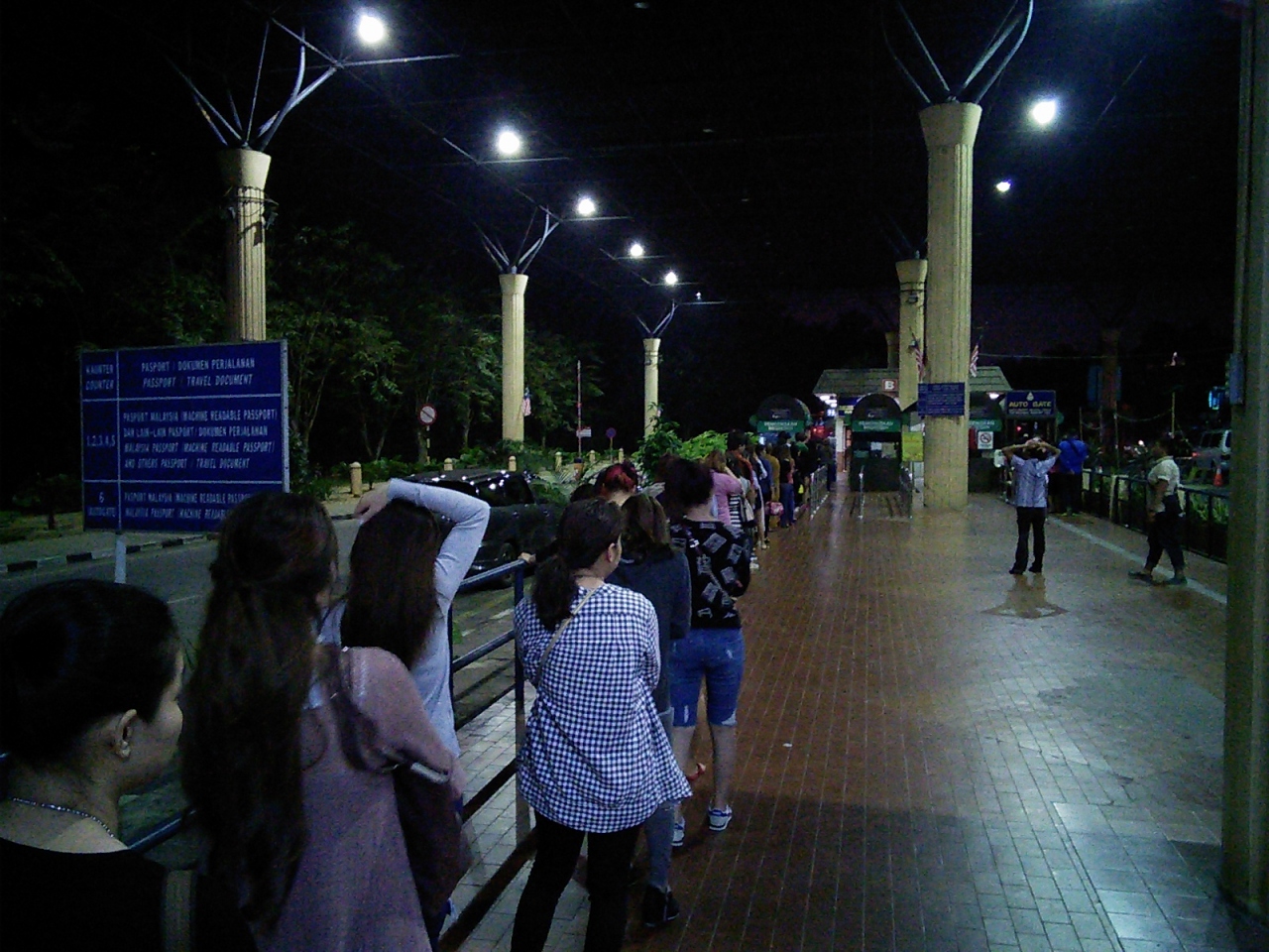 ハジャイ行きの国際バスはTBS(Bandar Tasik Selatan駅にある南部バスターミナル)から出ています。何社かのバスがありますが私の乗ったのはCity Express社、21:15発、55RM。2日前TBSまで行きチケットを買いました。当日はチケットを買ったカウンターで30分前にチェックイン済ませます。バスは21:40に出発。横3列のゆったりめのシートです。A/C効きすぎで寒いくらいですが一応薄いブランケットが用意されています。バスにはトイレは付いていませんでしたが2hおきくらいにトイレ休憩がありした。翌朝4:00に国境(ブキッ・カユ・イタム)から2kmほど手前にある食事のできるドライブイン到着。ここで一旦パスポート回収(持っているかどうかのチェックだけで特に意味はなさそう)。タイの入出国カードとともに返却されます。そして4:45に国境到着。国境が開くのは6:00なのでそれまで待機。国境が開きますが他にも多くのバスが待っていたのでイミグレは長蛇の列です。問題なく出国。またバスに乗り1km先にあるタイ側のイミグレへ。タイ側のイミグレも6:00オープン(注! タイ時間では5:00になります)。今度は荷物を持って下車し入国審査ですが特に荷物チェックはありませでした。両国のイミグレを通過するのに50分かかりました。そしてハジャイにはタイ時間の7:20に到着。総所要時間は10時間40分でした。到着場所はハジャイ駅近くのバス会社のオフィスでしたがその前にメインバスターミナルに寄ってくれます。