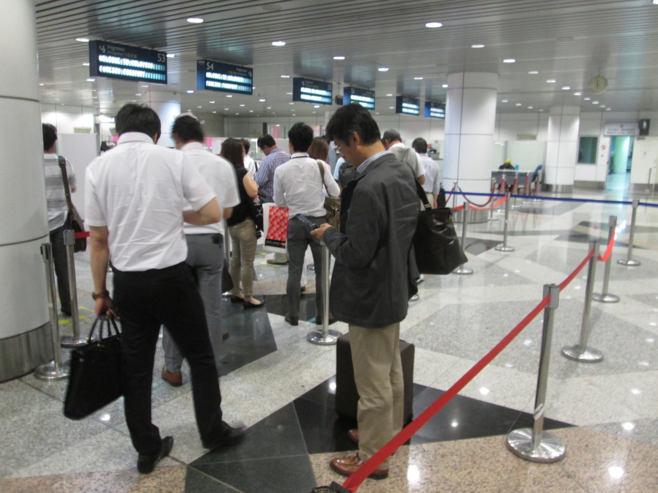 9/12の夜、クアラルンプール空港を出国しました。入国審査と同様、出国審査もマレーシア人用と外国人用に分かれています。入国時にパスポートに挟まれたシール、パスポート、搭乗券を係員に提示し両手人さし指の指紋をガラス越しに取られます。出国審査が終わりセキュリティーチェックがありますが、ここではノートPCを鞄から取り出す必要はありませんでした。