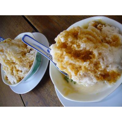 ざっくり削った氷に小豆、ゼリーみたいな緑色の粒(=これをチェンドルと呼ぶ)、ココナッツミルクと黒糖シロップがかかっているデザート。見た目に反し、甘すぎることもなく、さっぱりといただけます。