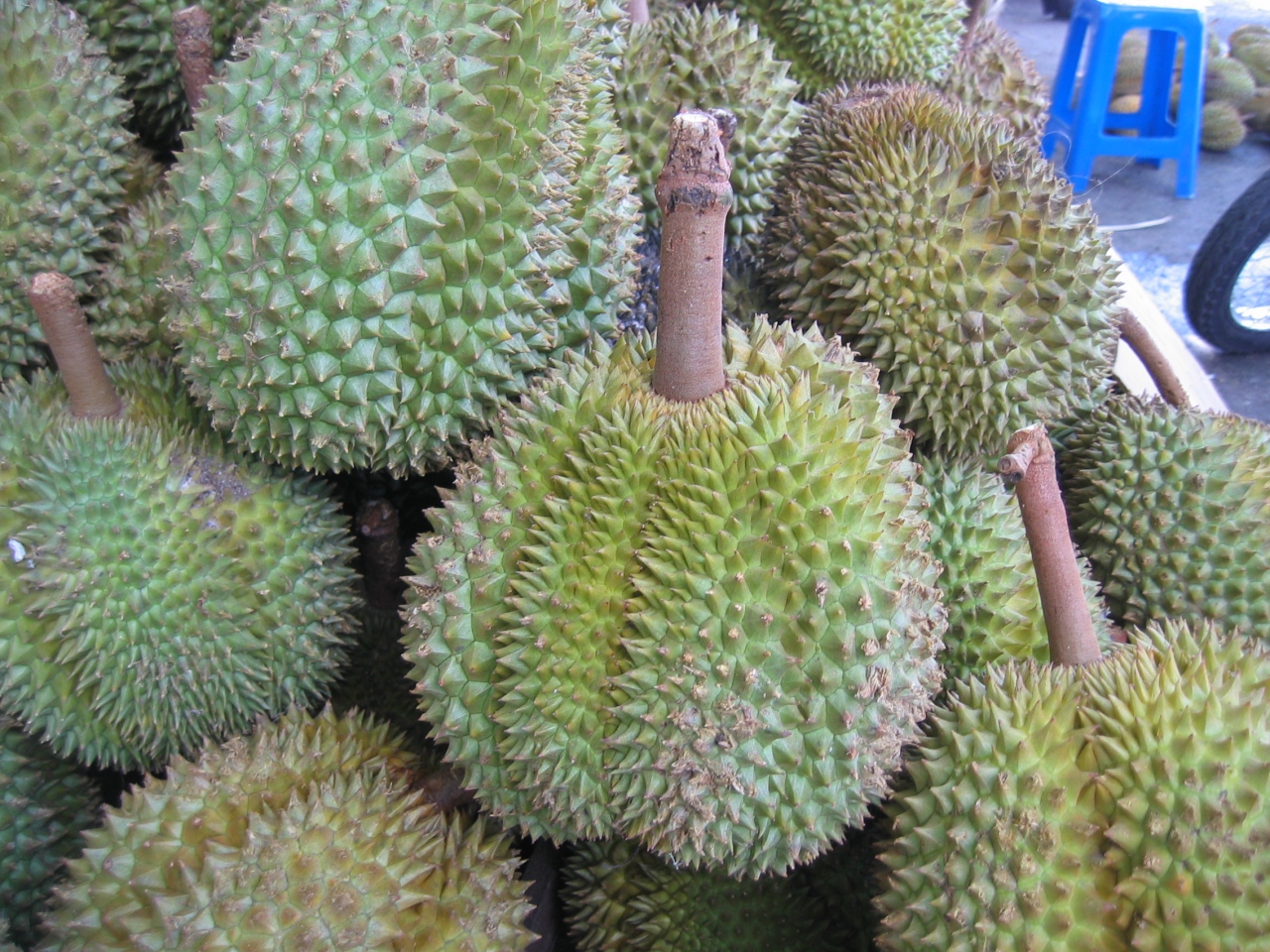 果物市場、ドリアンだらけ、でも、公共の乗り物、建物に持ち込み禁止