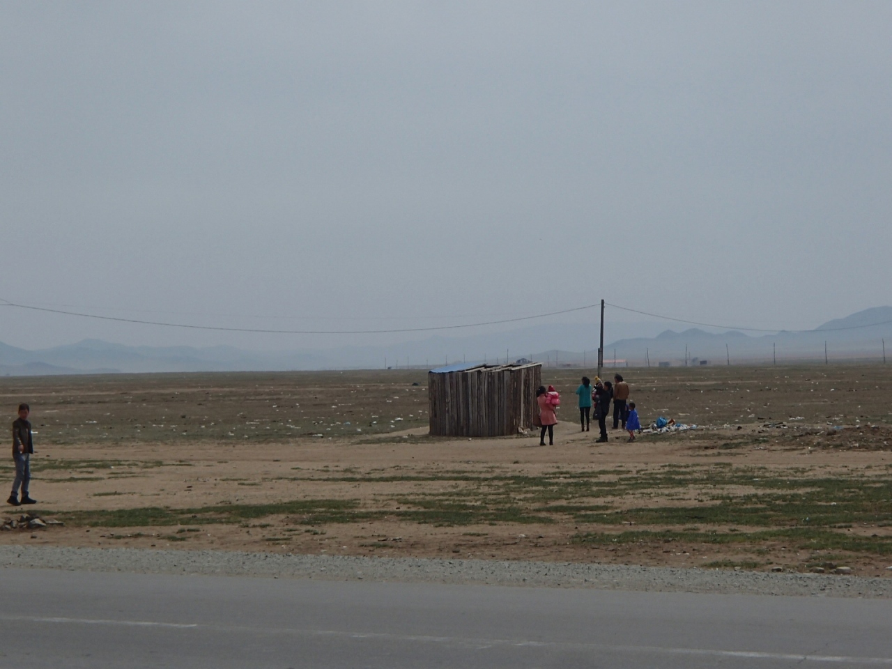 ウランバートル/ハラホリン(カラコルム)間のバス移動でのこと。昼食を兼ねて、往復ともに停車したドライブインで、女性陳は扉付きの小屋型トイレを利用。水洗ではない。両足の間の肥だめは深い。絶対に落ちるもんかと思った。テレルジやハラホリンのゲル型施設でも、このタイプの外の小屋で用を足すことになる。なお、男性陣はその辺で背中を向けながら野ションをしていた。
