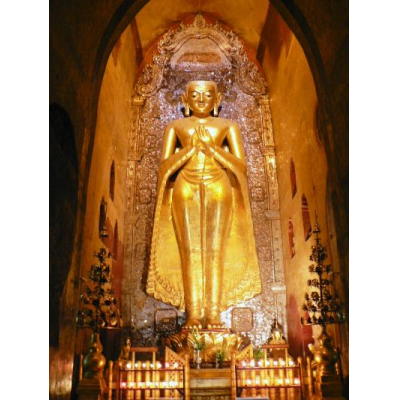 アーナンダ寺院は11世紀に建造されたバガンを代表する寺院。金色の仏塔はシュエグージー寺院の上部テラスから見ると夕日に輝き美しい。アーナンダ寺院には高さ10mの4体の仏像が四方を向いて納められている。仏像の一つは近くから見ると硬い表情だが離れて見ると微笑んでいるように見え、1000年前に良く表情の変化を組み込んで造られたものだと思う。アーナンダ寺院は、アノーヤタ王(1044?1077年)の統治中の1091年に建造を開始し、チャンスイッター王(1084?1113年)の統治中に、完成したと言われている。