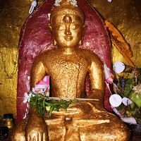 金ピカに輝くシュエズィーゴォン・パヤーの写真を撮っていたら、境内の片隅にいたおばさんから、“あそこの小さなパゴダの中にある仏像に金箔を貼ってみない”と呼びかけられました。