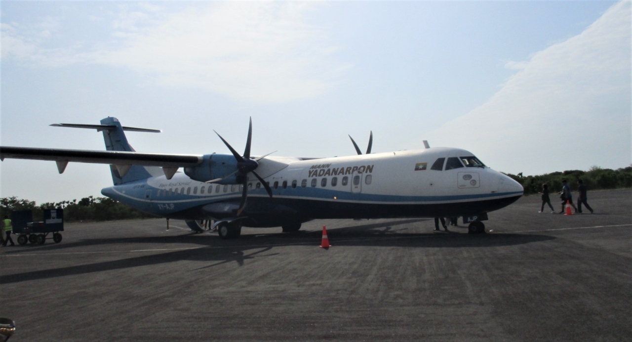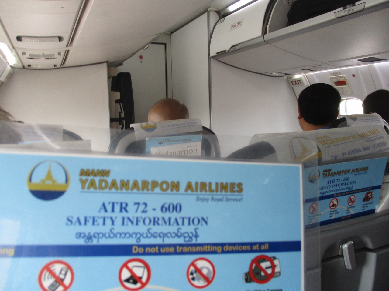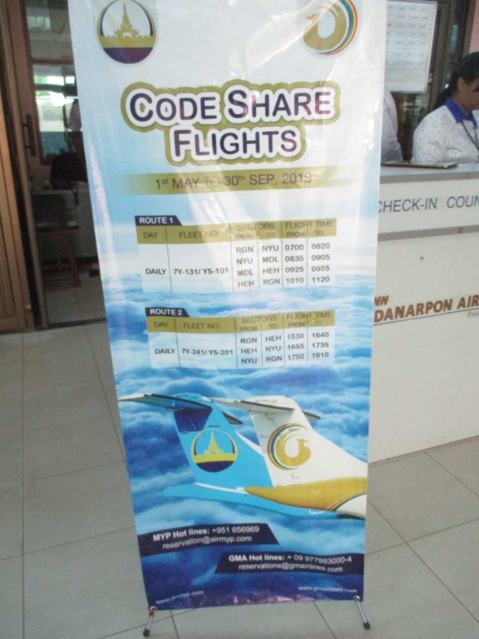 マンヤダナーポン航空(7Y)での立ち寄りルート路線でしたが、雨季のため乗客が少ないのでゴールデンミャンマーエアラインとのコードシェア便になっており、マンヤダナーポン航空(7Y)はバガン・ニャウンウー空港発とヘーホー空港発の便でマンヤダナーポン航空(7Y)の機体を利用しました。
