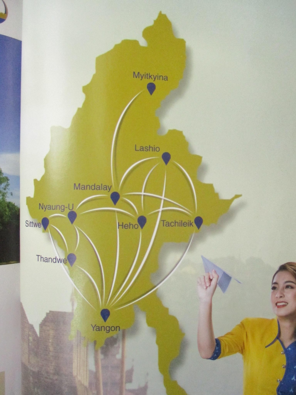 利用した航路は、ヤンゴン国際空港 (RGN)⇒バガン・ニャウンウー空港(NYU)⇒マンダレー国際空港 (MDL)⇒ヘーホー空港(HEH)⇒ヤンゴン国際空港 (RGN)の一部のコードシェア便で利用しました。