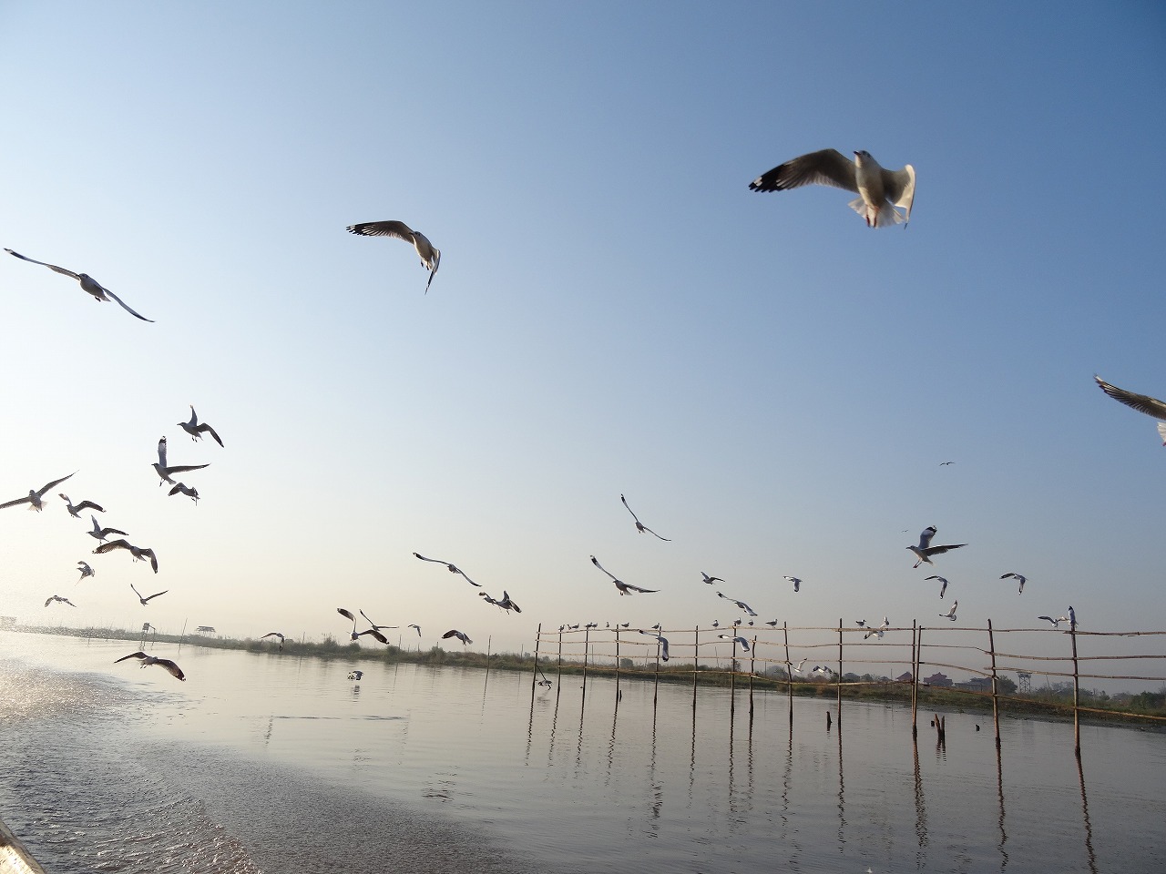多くの方は、ボート乗り場のニャウンシュエから湖上ホテルが集中している湖の真ん中あたり、あるいはその先のインディ遺跡までボートで行かれると思います。湖上ホテル付近までが、1時間、インディ遺跡やそのあたりのレストランまでは、さらに1時間、つまりボート乗り場から2時間です。昼12時ごろは、真っ黒に日焼けし、干上がりそうになりました・・・が、夕方、ホテルへ、また朝方、ホテルからニャウンシュエまで乗ったときには、あまりの寒さに凍えました。2月末です。寒暖の差は半端ではなく、風も吹きまくります!脱ぎ着のできる対策をがっちりしてください。