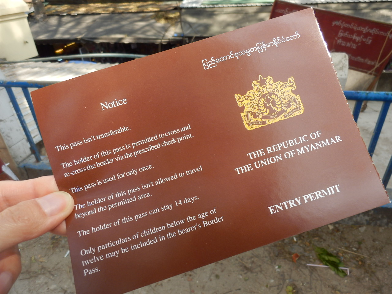 タイのメーサーイから国境の橋を渡って入国する場合に限って、ミャンマーのビザは不要です。ただし、ミャンマーではタチレイしか訪問できず、また、入国した場所からしか出国できません。
