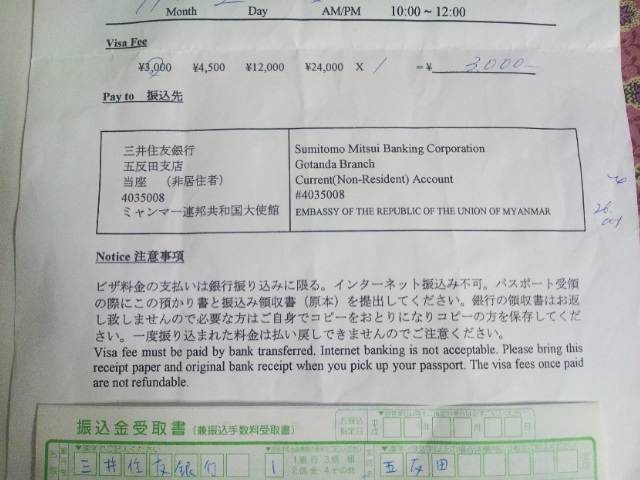 私が行ったときは、ミャンマー用ビザの振込で戸惑うお客さんが多く、「ミャンマー用ビザ専用の用紙の記入例」が置いてあり(笑)、係員が引き出しから持ってきて見せてくれました。