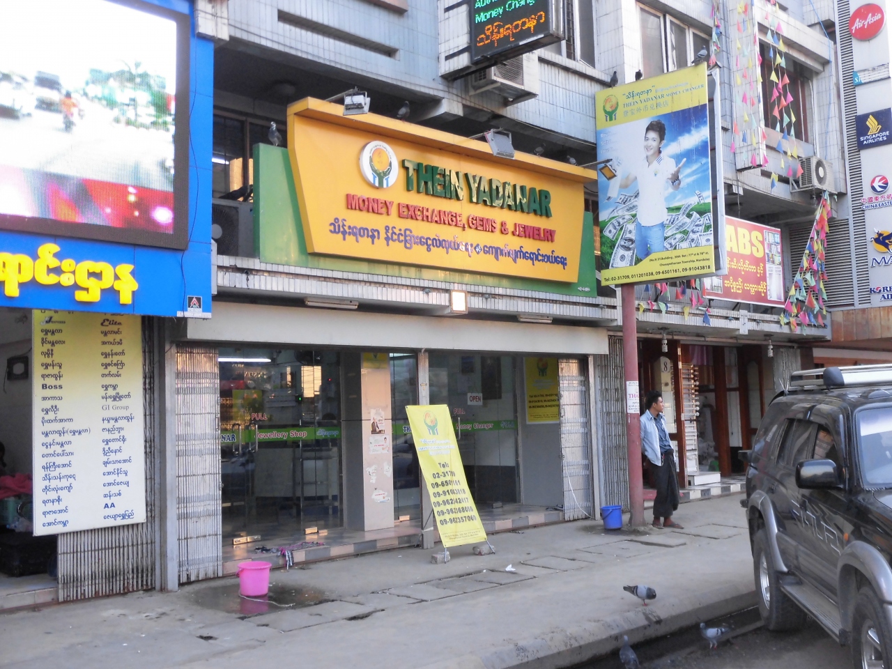 銀行は1ドル=1317チャットでしたが、ここは1340チャットでした(いずれも100ドル紙幣)。場所は駅東側正面道路を東に100m行った、南側です。反対側にAYA銀行があります。 -