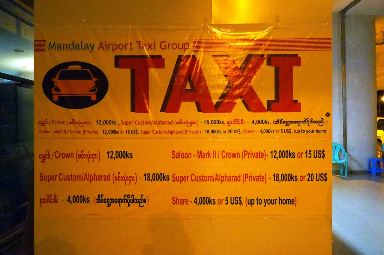 マンダレー空港の建物を出るとTAXIサービスの案内板が見えます。