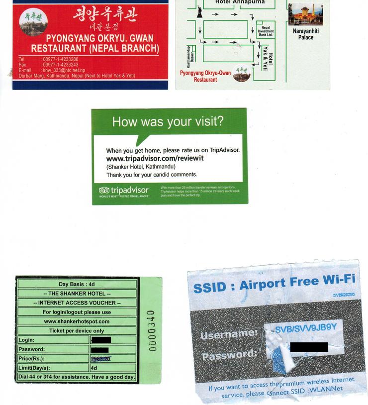 右肩に000034とあるものはカトマンドゥのホテルシャンカーで交付された4ナイト用Free Wi-Fi のパスワードである。