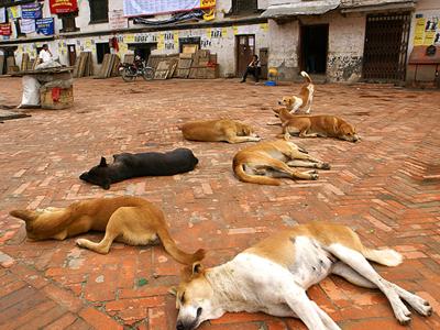 カトマンズの中心部「ダルバール広場」へと続く筋は舗装されている道は少なく、ぬかるみやゴミ、動物の糞など、凄まじく汚いです。舗装されている道でも、動物の糞がごろごろ落ちています。郊外へ行くほどさらに道は悪くなります。おそらく滞在中の8割は下を向いて歩いていたような気がします。ネパールはこれから、雨期が続き、雨が降ったり、止んだりと、さらに道はぬかるんでいくことでしょう。ちなみにぼくは、はき慣れたサンダルを持っていき、捨てて帰ってきました。現地で調達して捨てるもよし、持ち帰る荷物も少なくなるし、いいアイデアだと思いませんか?そもそも2・3日はいたサンダルは、触る気にもなりません。大半は写真の野良犬なのでしょうが、ぼくは見てしまいました!「ダルバール広場」のけっこう人通りの多いところで、おばはんがオープンエアで糞しているところを!