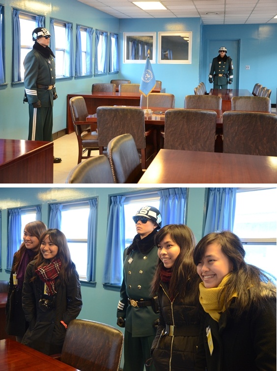 板門店ツアーの内容と注意点紹介のクチコミにもちょっと書きましたが、ここではJSA(共同警備区域)での写真撮影についてもう少し書いておこうと思います。 板門店(パンムンジョム)は、DMZ(非武装地帯)の軍事境界線上にあるJSA(共同警備区域)のため、板門店ツアー参加者の撮影には大きな制約があります。 2012年12月下旬に私たちが参加したツアーで体験した注意点は下記のとおり。 ●カメラのレンズは90mm以上は不可。 ●板門店へと入って行く統一大橋からは、ガイドさんに許可された場所以外は撮影不可。移動中のバス内の撮影も不可。 撮っていいかどうか迷う場所は必ずガイドさんに聞きましょう。 ●数少ない撮影許可場所のひとつは軍事境界線に跨って立っている軍事停戦委員会本会議場で、韓国側の自由の家と北朝鮮側の板門閣との間にあります。 軍事停戦委員会本会議場は外観だけではなく、中にも入って見学できる場所ですが、注意事項も盛り沢山。 ※体は板門閣方向に向け、撮影範囲は前面180度。 ※自由の家を警備する韓国側憲兵が立っている場所より先に行ってはいけない。 ※自由の家から板門閣方向に向かっている階段を下りてはいけない。 ※記念撮影時も、大声での笑い、指差し、ピース・サイン、手を振るなどの行為は禁止。 ※軍事停戦委員会本会議場への出入りはツアー全員で。 ※軍事停戦委員会本会議場内を警備する兵士との記念撮影はOK。ただし、触ったり話しかけてはいけない。兵士の後ろに回り込んだり、国連の旗が置いてあるテーブルと兵士の間を通ってはいけない。 ※軍事停戦委員会本会議場内の器物に触れてはいけない。…などなど。 私たちが板門店を訪れた時には、このほか撮影が許可されたのは、ポプラ事件のあった現場と帰らざる橋で、いずれも車内からのみ。 ポプラ事件と帰らざる橋については、下記のウィキペディアの板門店に関するページでどうぞ。 http://ja.wikipedia.org/wiki/%E6%9D%BF%E9%96%80%E5%BA%97 キャンプ・ボニファス駐車場脇にあるビル内のお土産屋さんも、ガイドさんに撮影を許可されました。