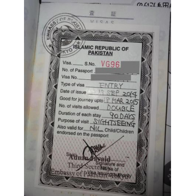 ・申請書は多少空欄があっても問題ないようです(最近のパキスタンは旅行者が少ないのでビザ申請歓迎、多少の不備はOK的な雰囲気があるらしいとどこかで読みました)。滞在日数1日と正直に書きましたが、希望した通り6ヶ月間有効のビザが貰えました。そしてシングルで申請しましたがダブルビザをくれました。