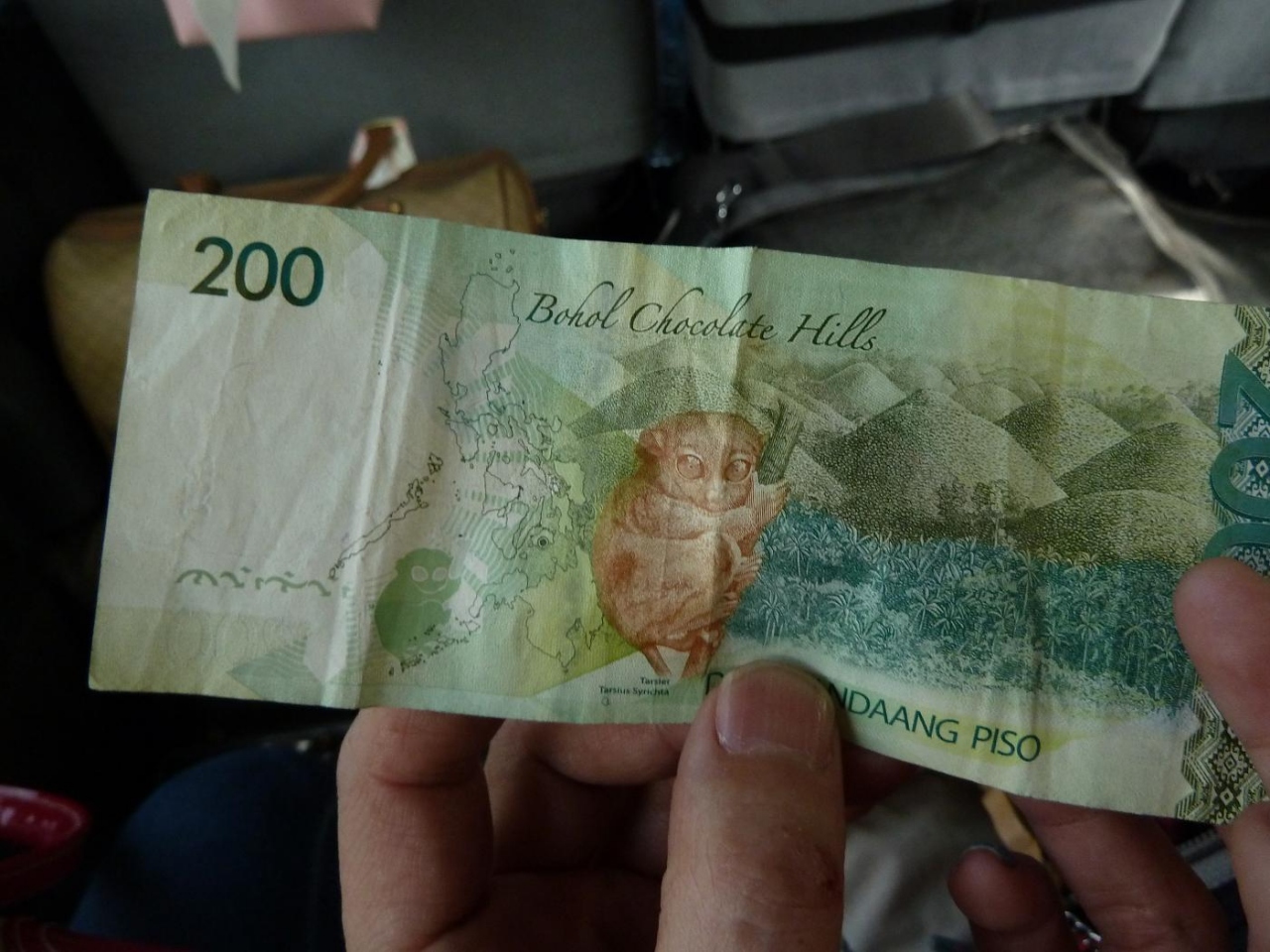 2000円札じゃないよね・・・(笑 P200 始めてみました いつからなのかな? これは使えない 万が一のために 撮影しておきました 表はこの人・・・・・んん・・・誰でしょうか? 裏には ターシャとチョコレートヒルっす おおぅ・・・・思わず感動 ボホールの名所とターシャが 紙幣の裏に描かれてる紙幣 良いっすね しっかりしまっていましたが どーしてもお金がなくなり 使ってしまいました もったいない・・・・(泣