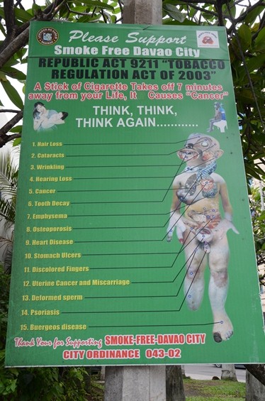 市内のあちこちに“SMOKE-FREE DAVAO”の看板や、喫煙が及ぼす害を示した解剖図看板が出ています。