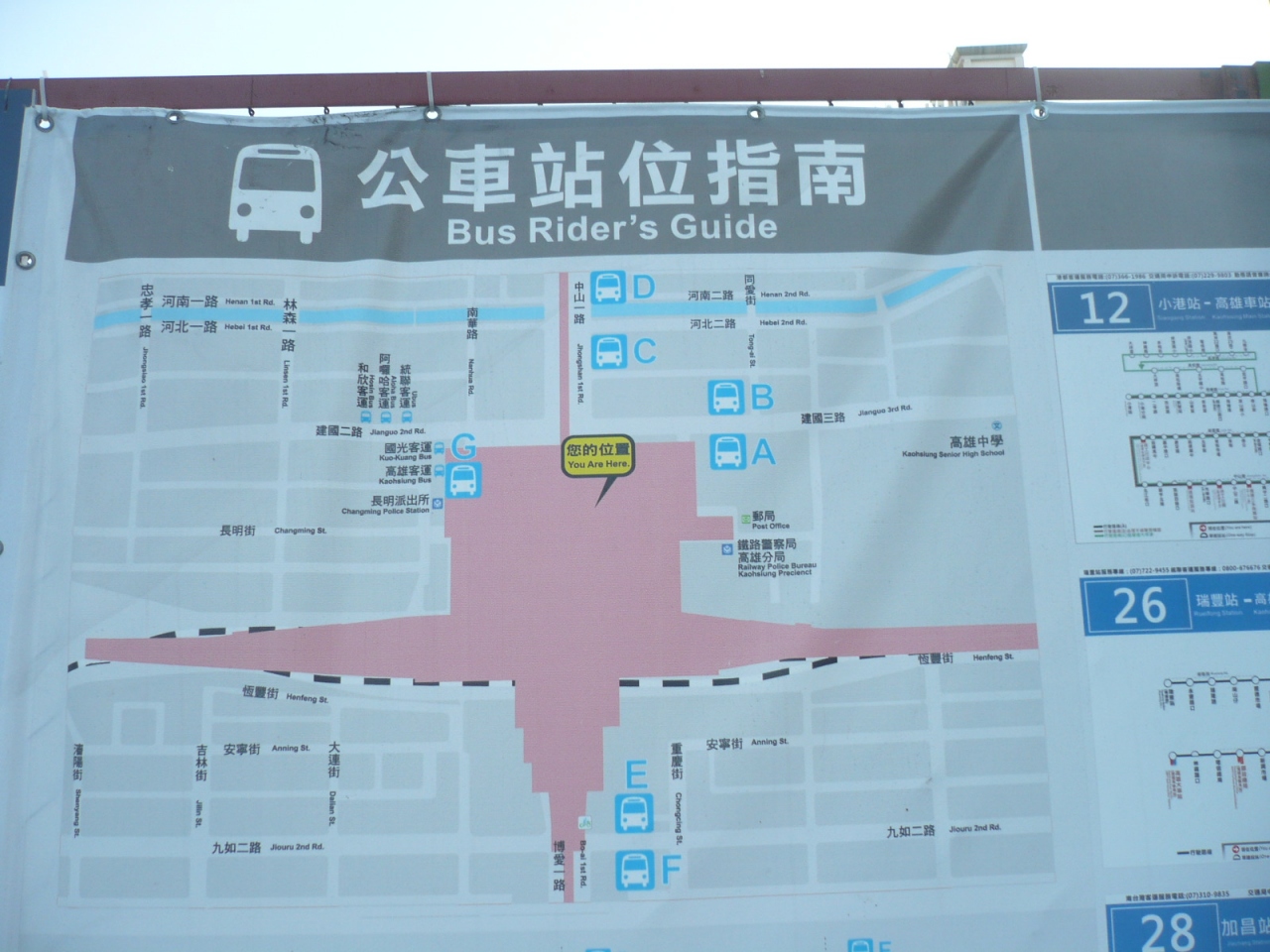 台鉄高雄火車駅前広場から出ていた公車(市バス)の乗降場が駅前広場工事のため4か所に分散しています。それらの位置が分かっていると無駄なく乗り場に行け能率的です。