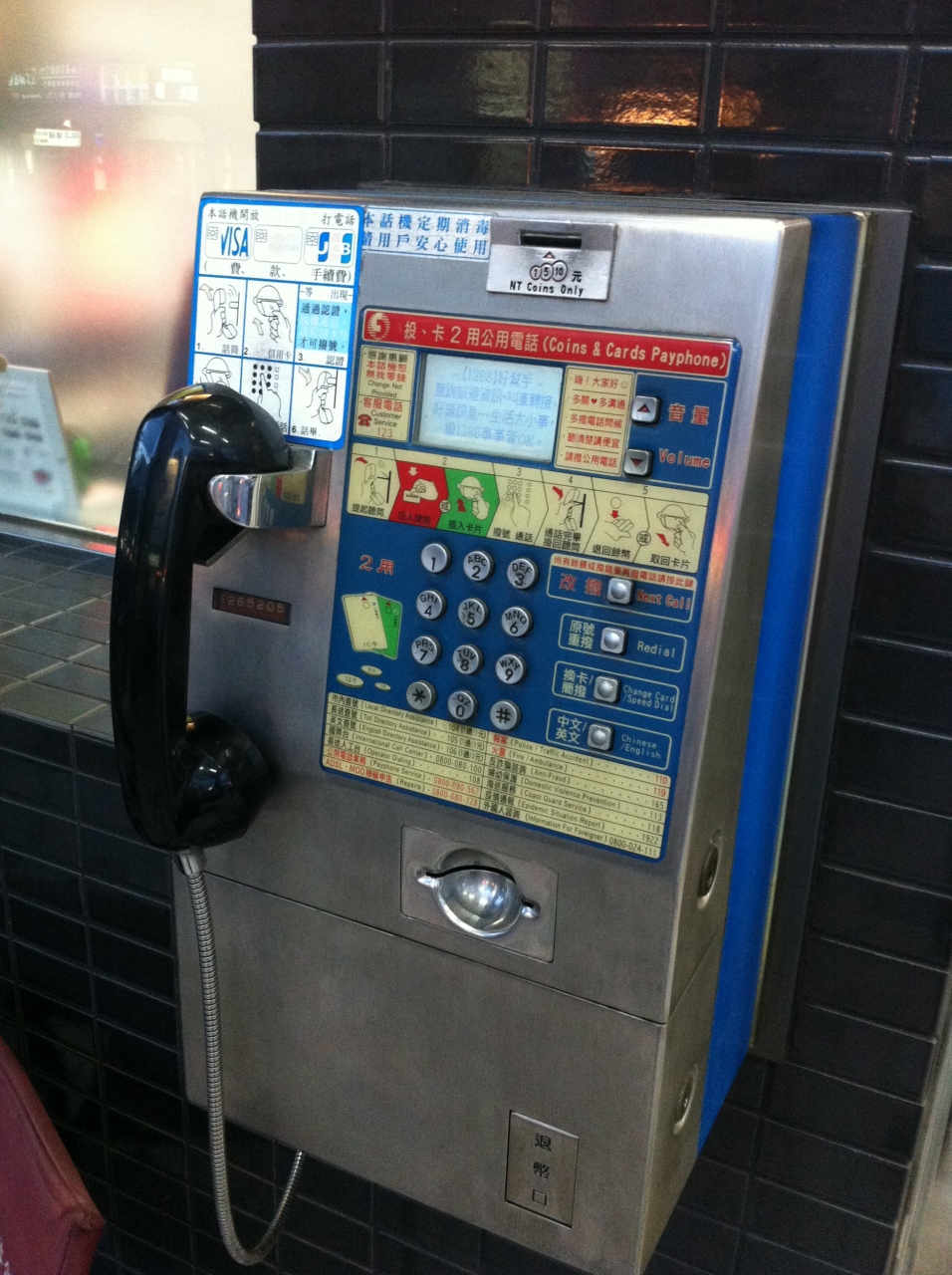 まー 今時は格安SIMがあるし、wifiでも通信可能なので必要としないかもしれませんが携帯電話を忘れた、盗られたなどのトラブル時には、公衆電話という手もあります。英語と中国語の併記でなんとか使えるのではないかと思いまして投稿します。