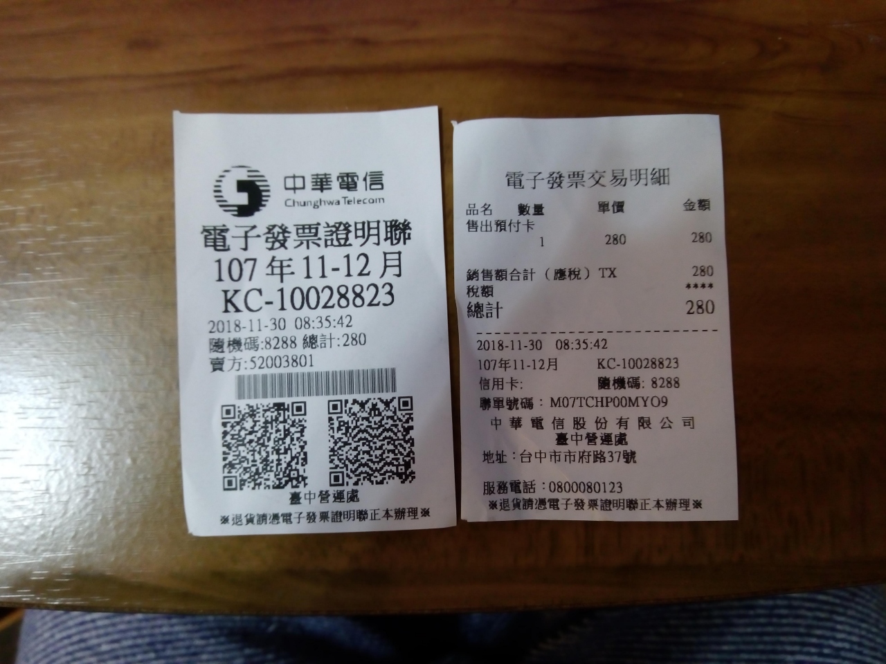 通信速度: まあまあ速い つながりやすさ: まったく問題なくつながる 手続きレベル: 特に難しくはない また使いたい: はい最近の海外個人旅行では情報収集に現地でのネット環境は欠かせなくなった。以前はホテルやレストランのWIFIサービスを利用していたが、接続が不安定で心細い。ローミングサービスやイ○トの****等もあるが、貧乏旅行者には高すぎる。なので現在はアマゾン、もしくは現地でプリペイドSIMを購入することにしている。今回台湾に旅行にするにあたり、プリペイドSIMを探した。まずはアマゾンで、台湾5日間データ無制限というSIMが売られていたので購入した。値段は720円。しかし、このSIMのキャリアはいわゆるMVNOで台北以外では使いものにならないという情報を購入後得た。今回の旅行は台中と礁渓温泉と太魯閣を巡る7泊8日の旅で、台北は到着時と帰国前日だけ。失敗したと思い即返品。台湾で最大手の中華電信のプリペイドSIM5日間データ無制限で1150円。中華電信のホームページで事前購入をして桃園空港で受け取る仕組みだ。しかし、ちょっとお高めだ。別にデータ無制限じゃなくてもいいから旅行中だけ使えればいい。空港で購入できるのはデータ無制限のプリペイドSIMのみで、7日間もので2000円。いろいろ調べてみると現地の中華電信のショップでプリペイドSIMを購入するという方法もあるらしい。中華電信のホームページより、4Gで30日有効1.2GBデータ通信込で300元(約1200円)、これが今回の旅行にはちょうど良さそうなので、台湾で購入することにした。今回は桃園空港から台中に直接行く計画なので、プリペイドSIMを購入するとしたら台中だ。一応 Google mapで台中のホテル近くの中華電信のショップを調べておいた。台中到着後、ホテル近くのショップに行ってみたが、プリペイドSIMは置いていなかった。やはりカスタマーセンターがある大きな店舗じゃなきゃダメか。翌朝、ホテルから歩いて20分程離れた市府路にある中華電信南台中服務中心にいってみた。店舗に入ってみると、大きな店で、ここならありそうだ。言葉がわからないので予め用意していたプリペイドSIMの画像を入り口に立っている店員の女性に見せたら、頷いて無言で整理券を発券してくれた。まだ開店したばかりなので客は少なくすぐカウンターに呼ばれた。担当の女性に筆談で”計量型4G(1.2GB)預、、”と書き終わる前にこちらの意図を理解したらしくプリペイドSIMプラン(預付卡)の表を提示してくれた。その中で16日有効の計量觀光卡類型1.2GB型(1.2GBデータ込)で280元というのが良さそうだ。ちなみにこの女性、片言の日本語と英語は理解できた。まずスマホを彼女に渡しSIMが利用できるか確認。利用できることが確認できたら、スマホとパスポートを渡してしばらく待つ。それからもうひとつ身分証明書の提示を要求されたので運転免許証を渡す。現在台湾で外国人がSIMを購入する場合は身分証が2つ必要だというのは事前に調べて知っていた。15分程でスマホ(セットアップ済)とパスポートと免許証が返却されて、料金280元を支払い(現金のみ)、A4の書類(何が書いているか解らないが中国語で3枚)にサインして終了。