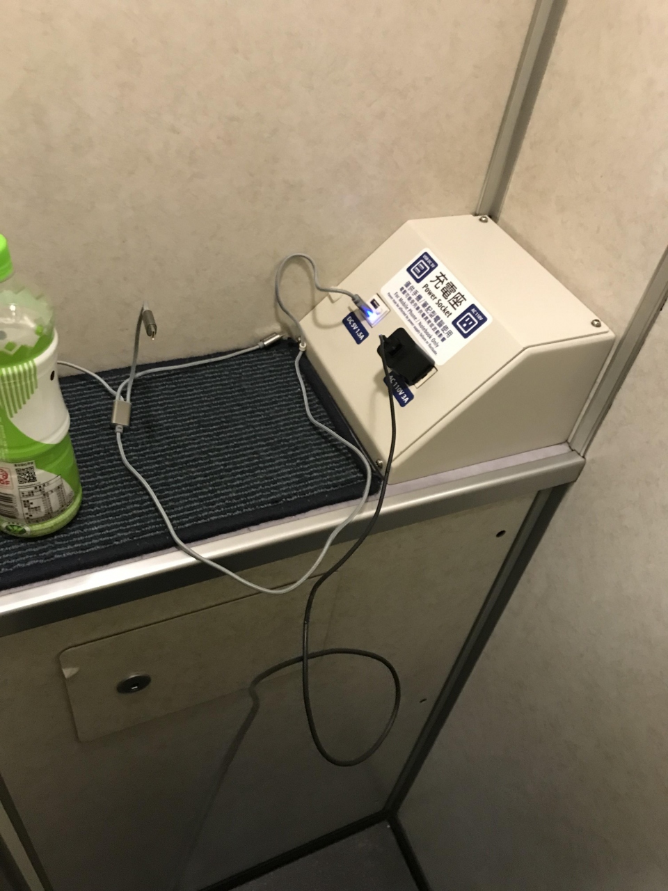 台湾の新幹線の中で、座席指定の際に4,12号車を指定すると、充電座ということになります。ただし日本の新幹線のように、個々の座席にコンセントはなく、1番先頭に、電話ボックスのような充電室があり、そこで充電します。個々の座席に欲しければ、ビジネスシート予約する必要があります。