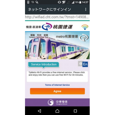 台北駅から桃園空港第二ターミナルまで、桃園MRTを利用しました。Wifiルーターを持っていましたが、試しに車内にWifiがあるかチェックしてみたところ、フリーのWifiが使えました。ただ、通過している場所によっては電波があまりよくないのか、使えない時もありました。