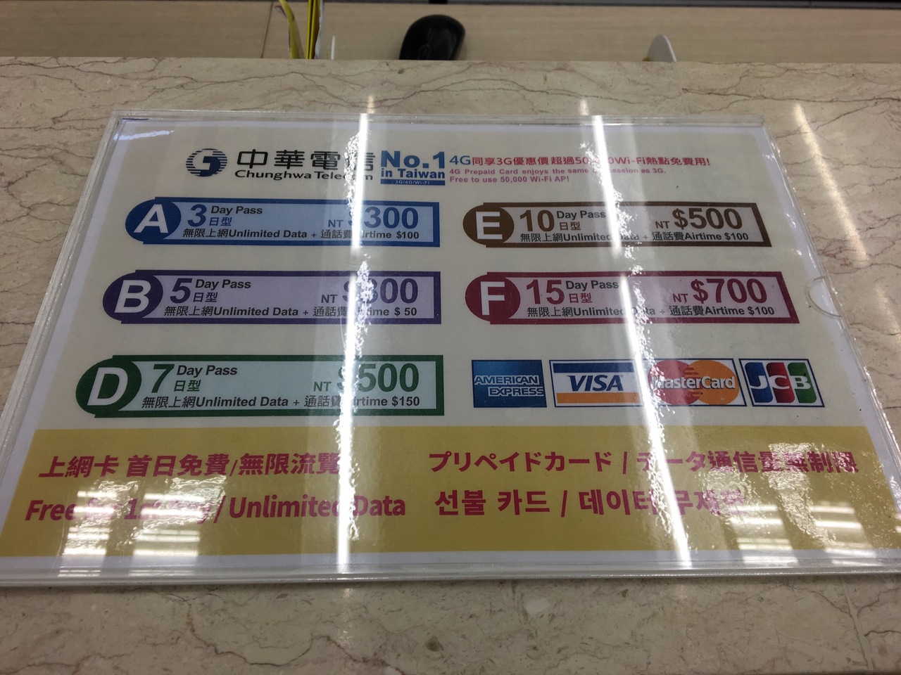 通信速度: まあまあ速い つながりやすさ: まったく問題なくつながる 手続きレベル: 誰でもできる また使いたい: はい制限区域を出てすぐのカウンターで中華電信のSIMカードを購入しました。パスポートのコピーを取られ、設定は2分ほどで終了。元のSIMカードを入れる袋をくれるのもポイント高いです。市内で問題なく繋がりました。