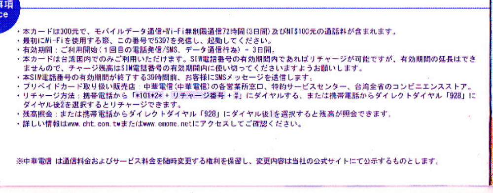 松山空港でSIMを購入。3日間通話可能なプランで100NTD。端末の設定は係員にやって貰えます。開通した事を確認した上で受取です。