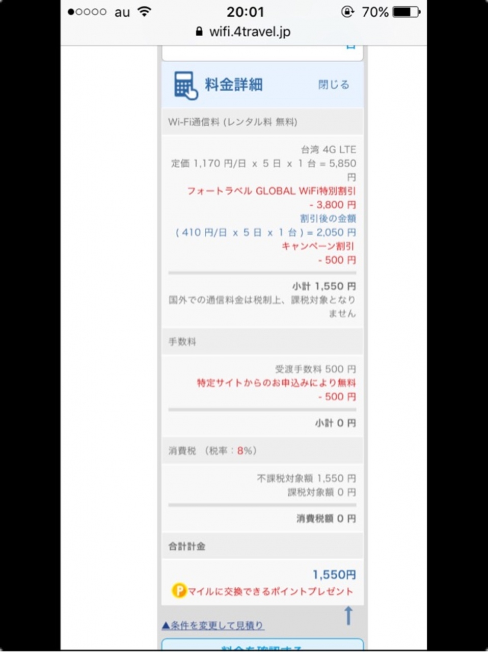 4トラのページからが断然安かったのでおすすめです。空港引き取りもすぐでした。余計なものも入っていないので、コンパクトで思ったほど荷物になりませんでした。最初の充電もちゃんとされていましたし、電波は台北の街中では早くて問題なしです。