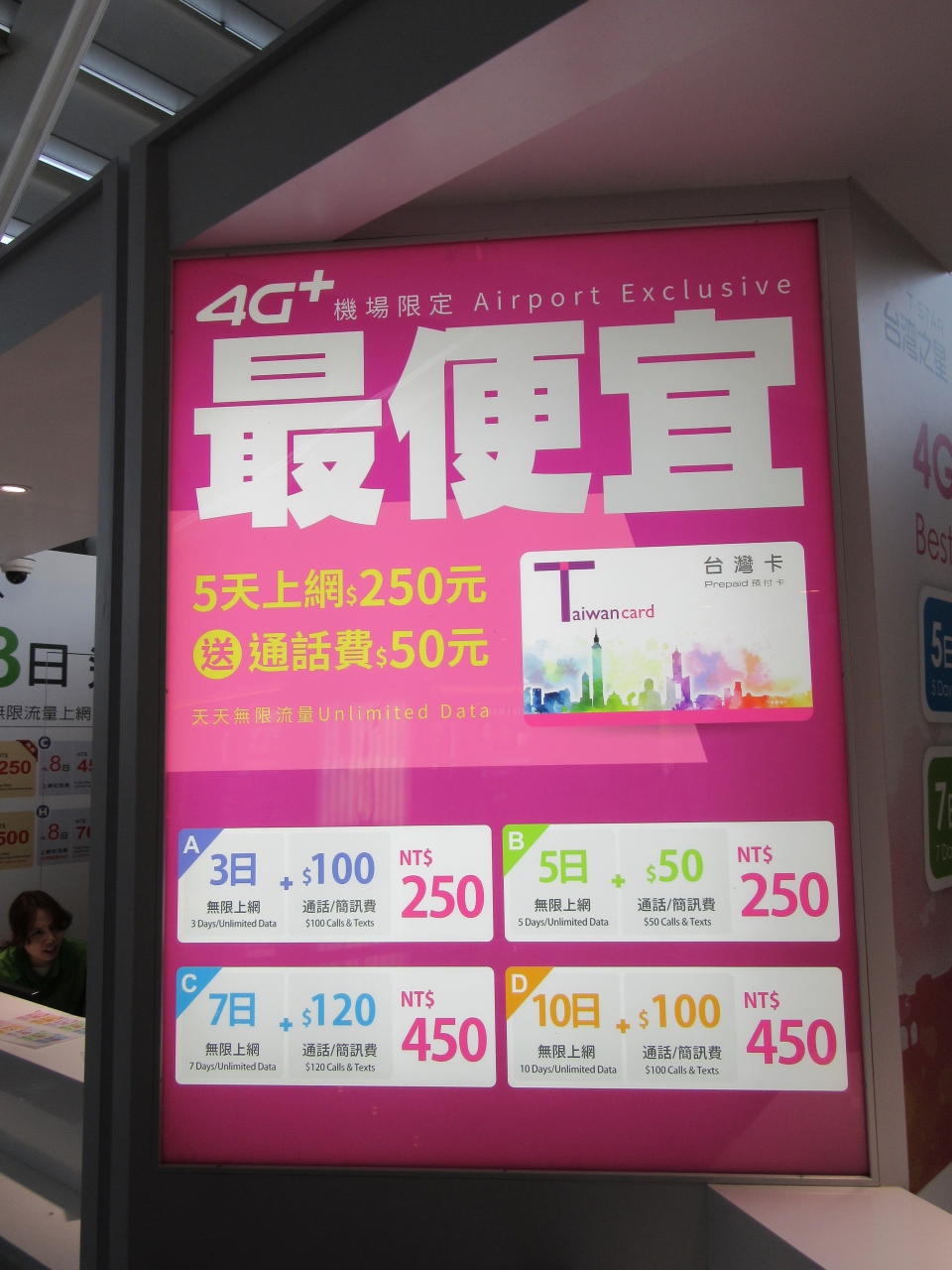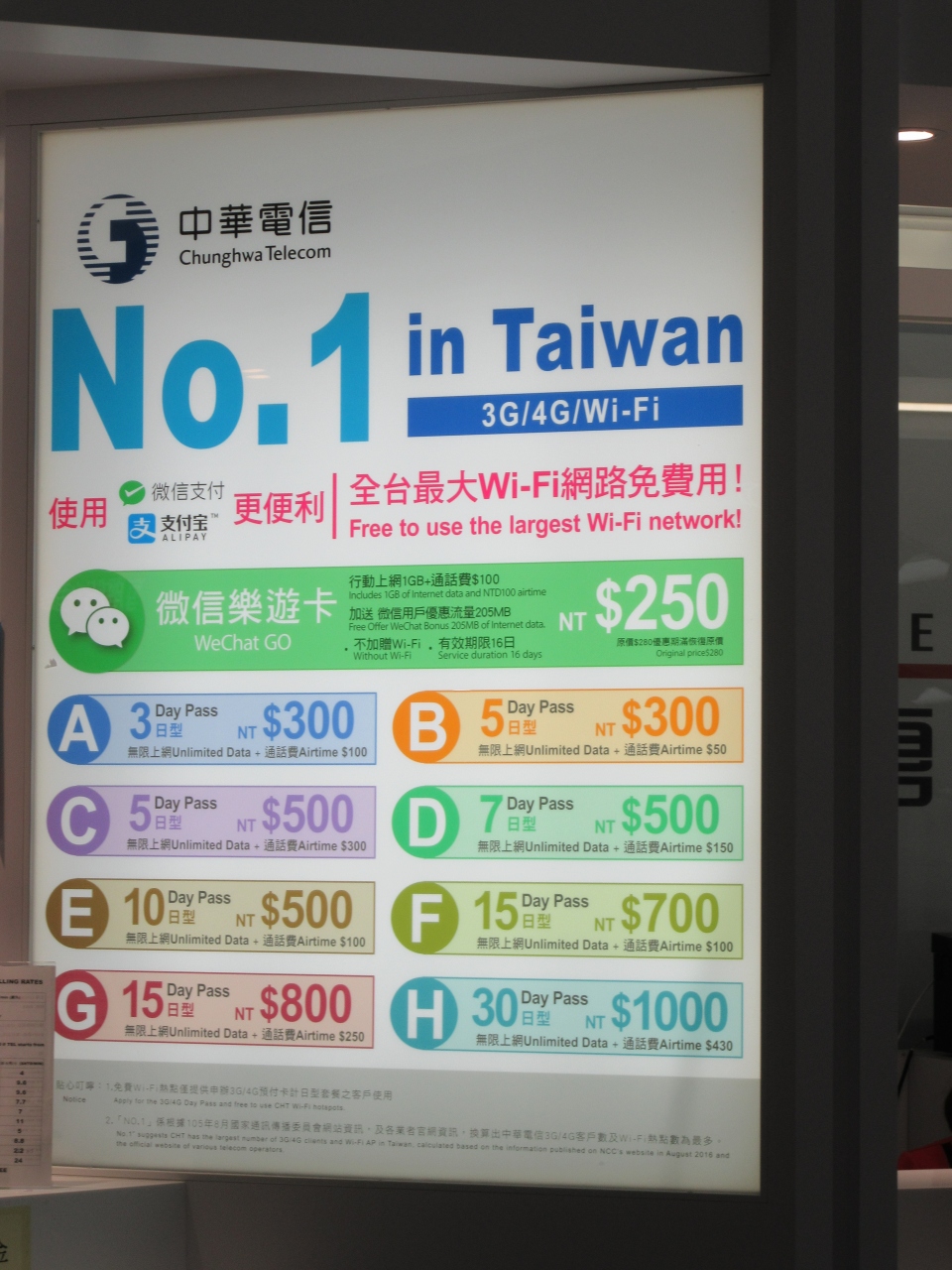 中華電信をいつも使っています。今回も30日3G/4Gデータ通信上限なし。通話430NT$分つきで1000NT$です。速さも早い。日本の格安ではスピード・コントロールされて不快な思いをすることが多いが、こちらでは全くそのようなことはありません。4Gのせいかな。