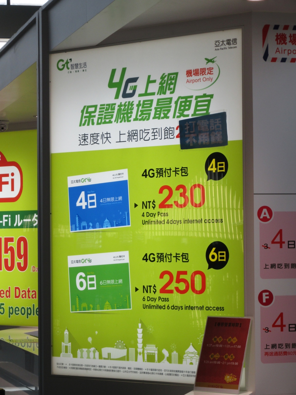 桃園機場の電信服務カウンターに行くと、携帯ショップがあり、ここでSIMロック解除済のスマホとパスポートを提示して、SIMを入れ替えて、開通確認を行った後に、スマホと今迄入っていたSIMカードを受領して、手続きは完了。