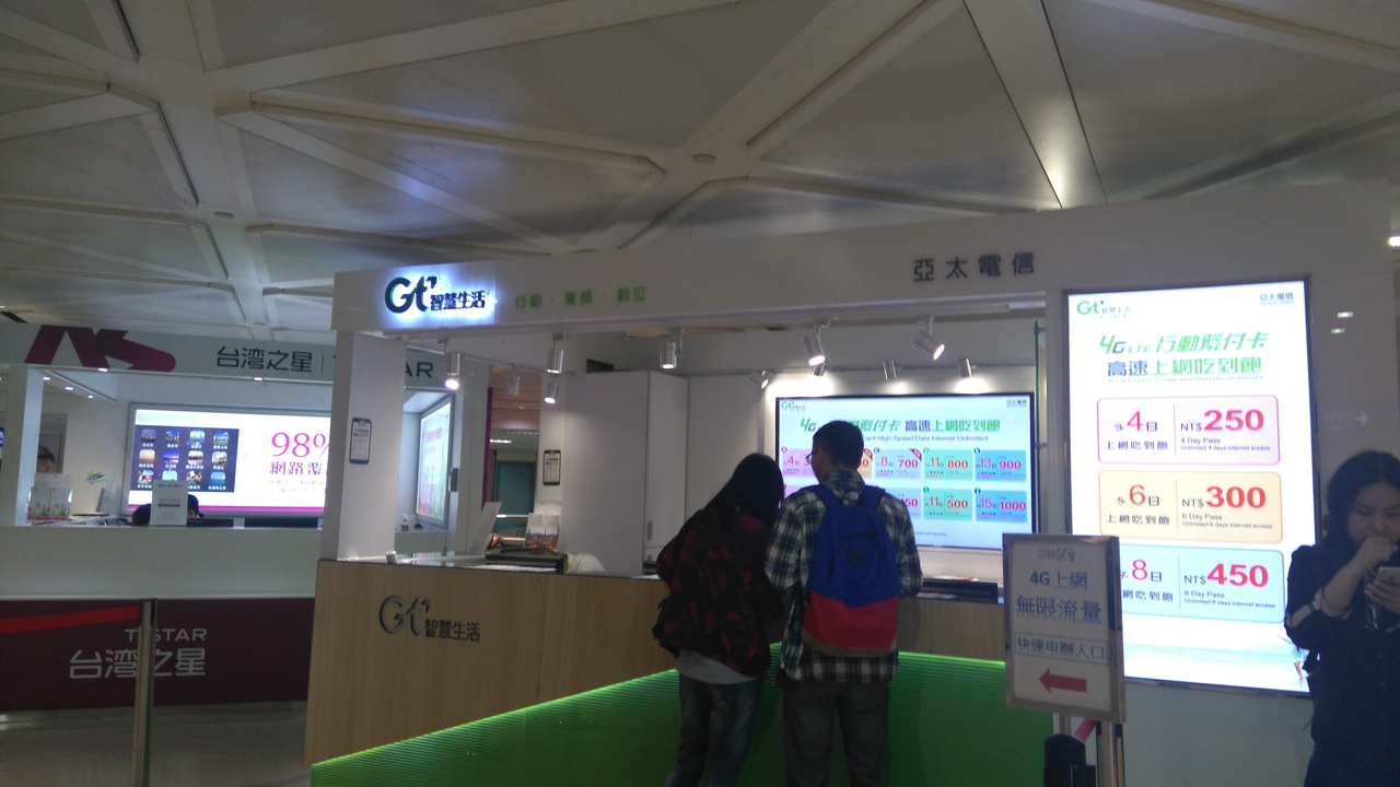 桃園国際空港第2ターミナルの制限エリアのみで販売されている亞太電信のプリペイドSIM CARD(4G対応)を日本から持参したSIMフリー端末に差して使用しました。4Gがキャッチできるエリアは少なかったですが、4Gエリアでは速度も快適でした。4日間でデータ通信のみ250元(カード決済で951円)と他のライバルにはない価格設定が魅力的でした。次回も亞太電信を使用したいと思います。