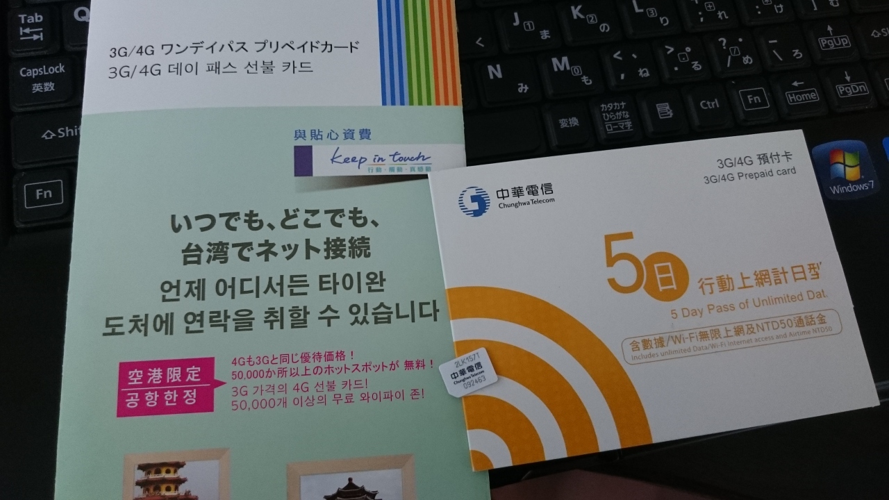 松山空港の中華電信カウンターで旅行者向けのプリペイドSIMを購入して使用しました。