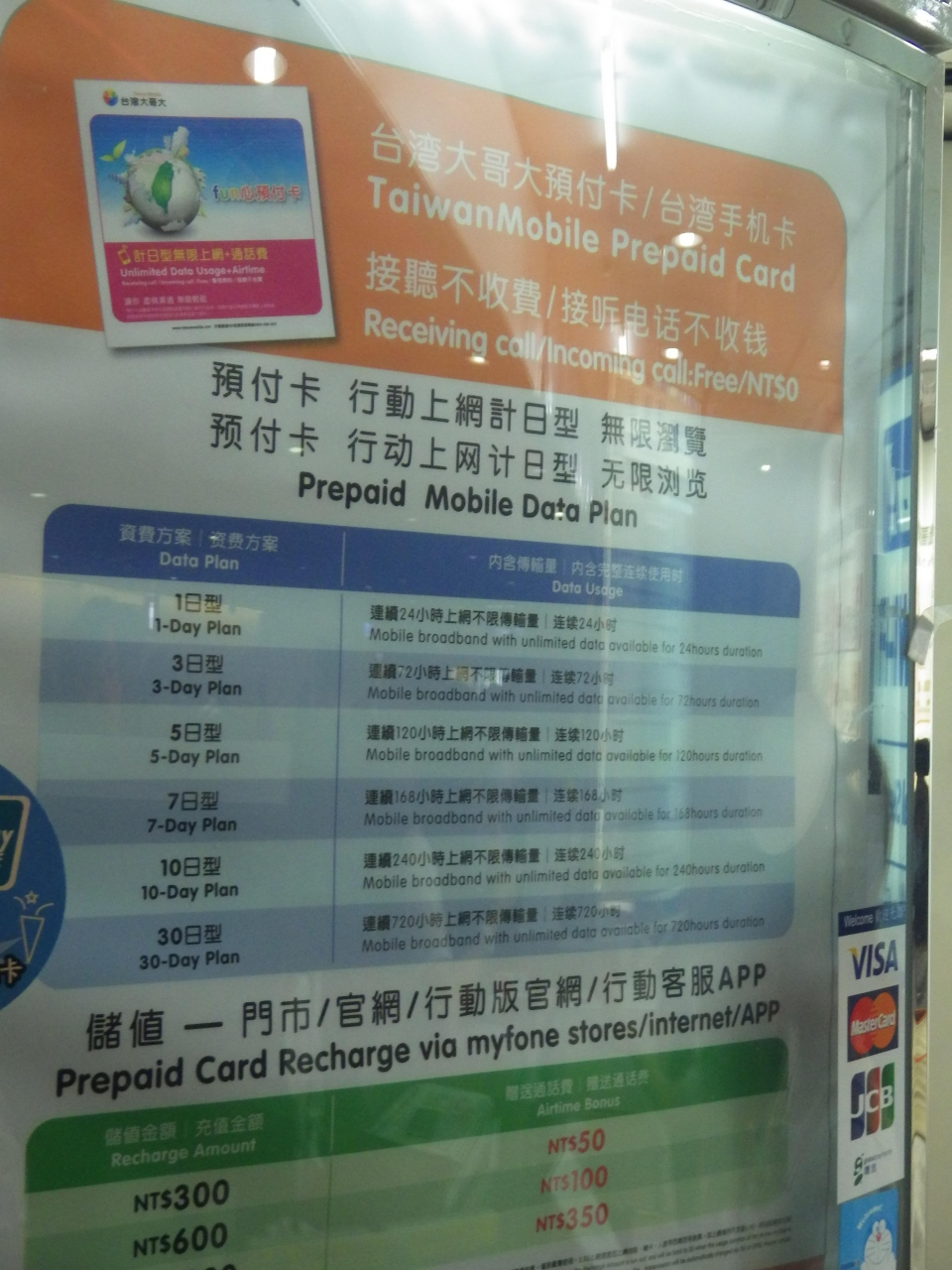 中華電信、台湾大哥大、遠傳の3つがありますが、どれも大体一緒です。