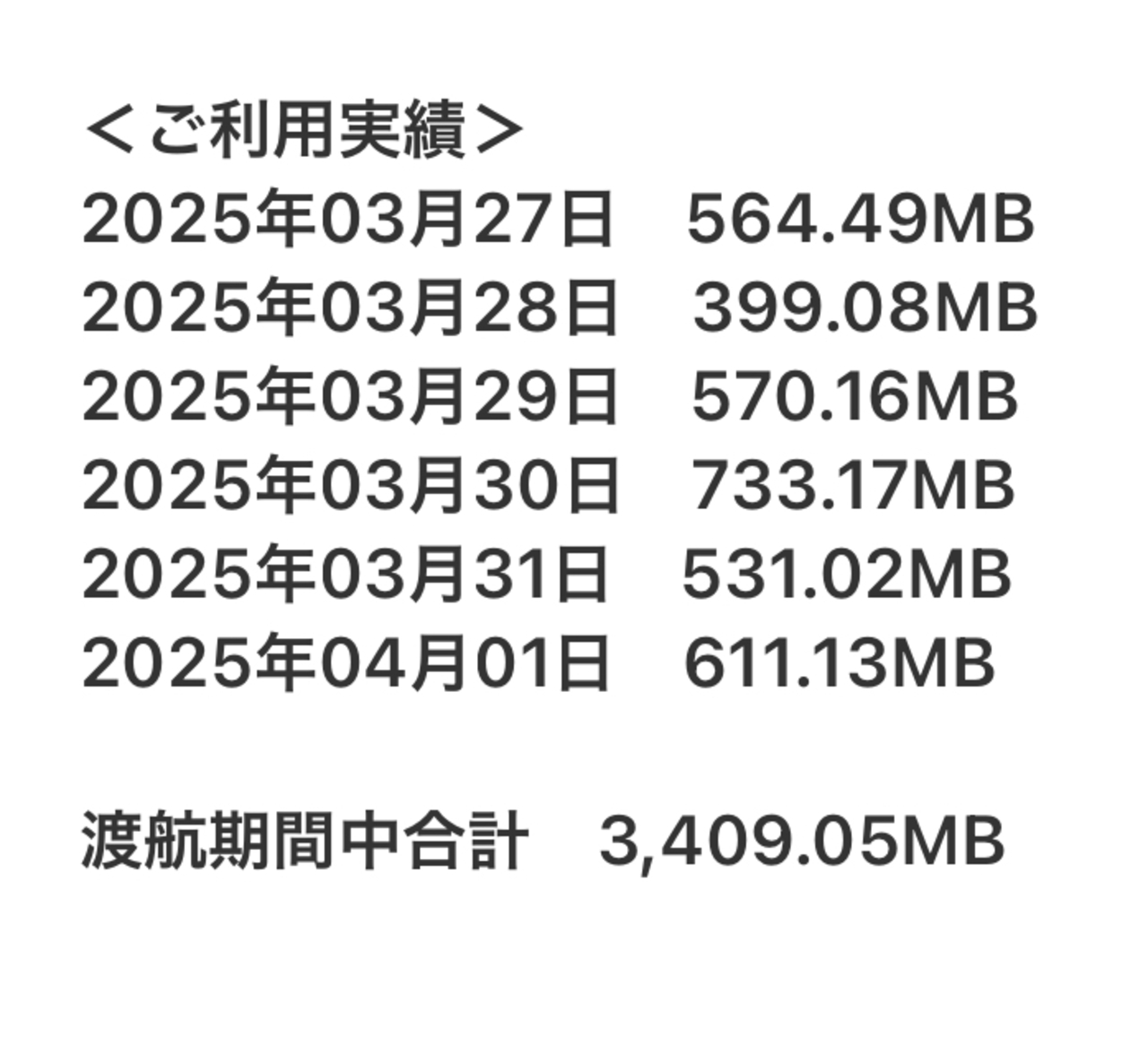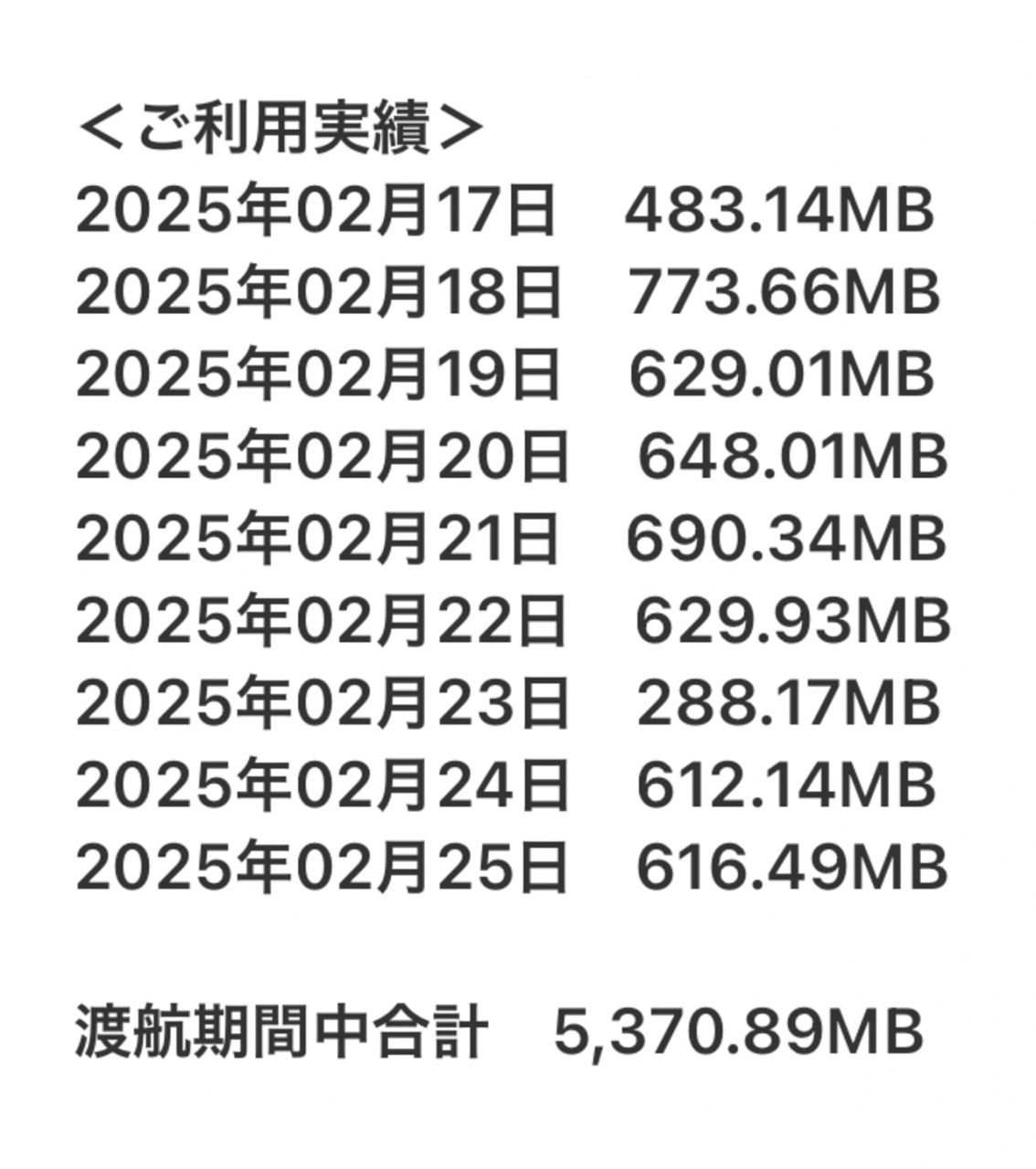 便利なのは、毎日の使用量をメールしてくれることで、今回は、前回使った 使用量✕人数 を参考に容量を決めたので、入出国日以外は、大きく余る事なく使えた。