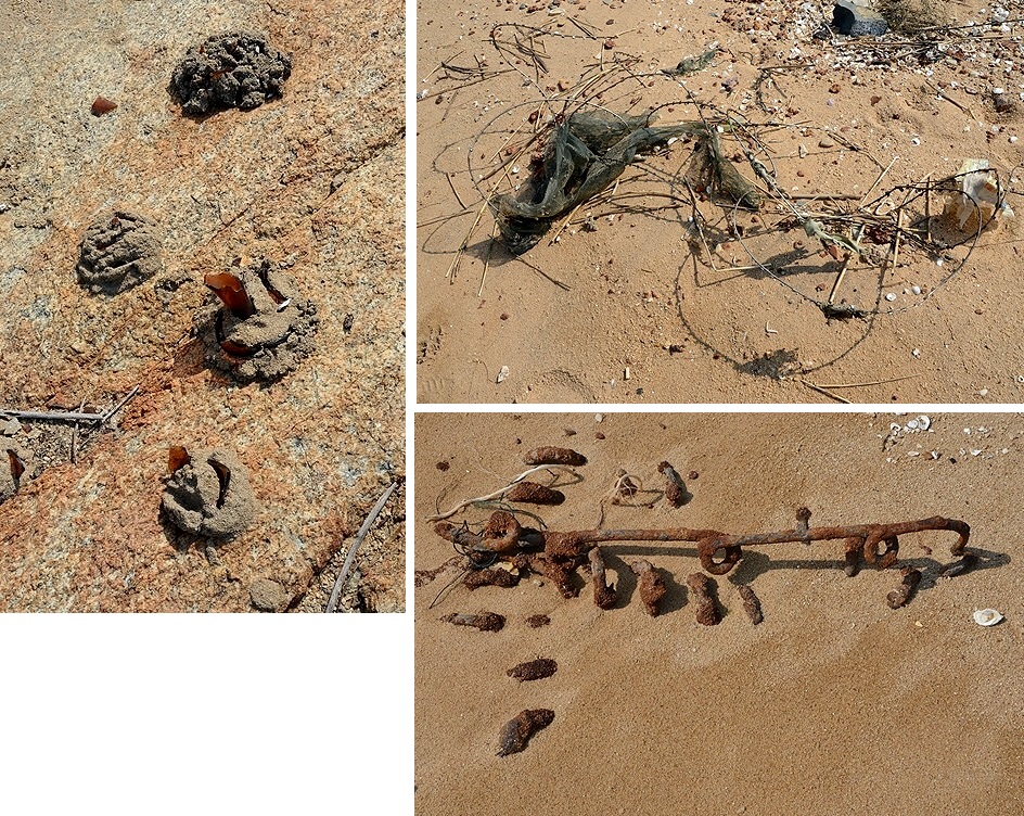 地雷の危険が無い浜辺でも、敵艦の上陸を阻むために設置された軌條砦や、上陸してきた敵兵を傷つけるためのガラス片を埋め込んだ岩場があったり、ステンレス鋼かみそり有刺鉄線の一部、武器(?)の残骸が流れ着いたりしています。