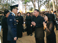 彼女の勇敢さと大きな優しさを敬いシリキット女王陛下からの聖水そしてお見舞金50万Bを届けに皇太子様と進トン王女様が出向かれた・・普通ではありえない光景に誰もが驚きを隠せない・・それは今までにも多くの葬式に参列されてきた方々がこの山奥のトイレも困るような場所での葬式に参列されたこと・・それはタイの国民にとり最大の栄誉そして未だかつて見たことがないタイの皇室の恩恵にさらに驚きを示す外国人なのである。そしてなによりもお葬式のために現地の学校から訪れた生徒達・・その生徒達の目に大粒の涙と残されていた宿題はタイ国内中を涙で埋めていた。安らかに・・ -