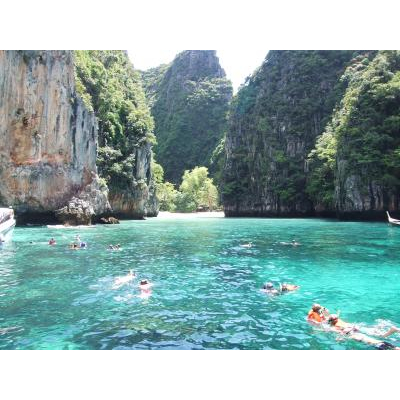 日本で予約していくと高いツアーも現地の旅行代理店だと表示価格の半値以下になったりします。ピピ島とカイ島に行くツアーの予約をしましたが、2500Bと記載のあったものが、大した値段交渉もなくあっけなく1200Bに下がりました。ツアーはたくさんありますが、どれを選んでもさほど内容は変わらないようです。大型船を利用すると800B程に下がりますが、時間のロスも大きいのでスピードボートがお勧めです。英語ツアーですが英語が得意でなくても、全く問題ないと思います。送迎からランチ、シュノーケリング等必要なものが全て込みになっているものがほとんどなので、当日はチップ程度の小銭持参で丸一日充分楽しめます。