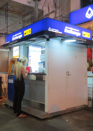成田からバンコク乗換でプーケットに着きました。両替はバンコクでの方がレートが良いとの情報もありましたが、乗換時間も短かったので、プーケットですることに。国際線のバゲッジクレームで荷物が出てくるのを待っている間にすぐ横にあった両替ブースで円からバーツに両替しました。空港からのタクシー利用に必要ですし、滞在したマイカオビーチではホテル以外では両替所は見かけませんでした。