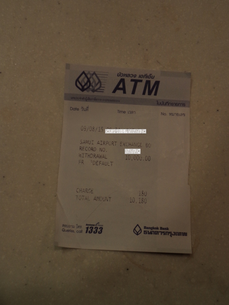 チャウエンのような賑やかなリゾートの滞在ではないのと、帰りにバンコクへ立ち寄る為に一回で済むように、サムイの空港のATMを選択しました。