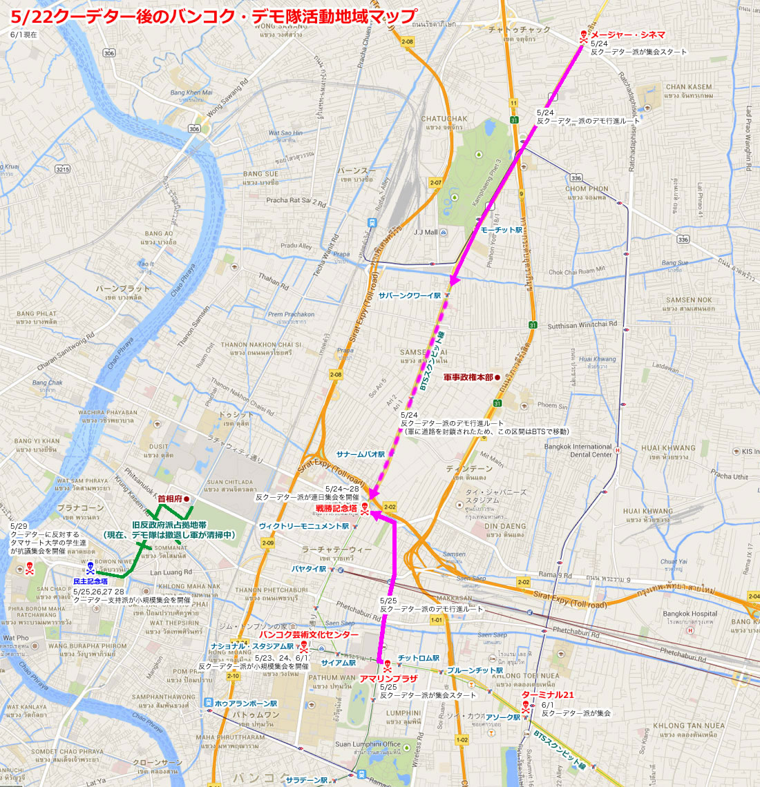 5/22に発生したクーデター後に登場した、反クーデター派およびクーデター支持派がデモ活動を行っている場所をまとめました。