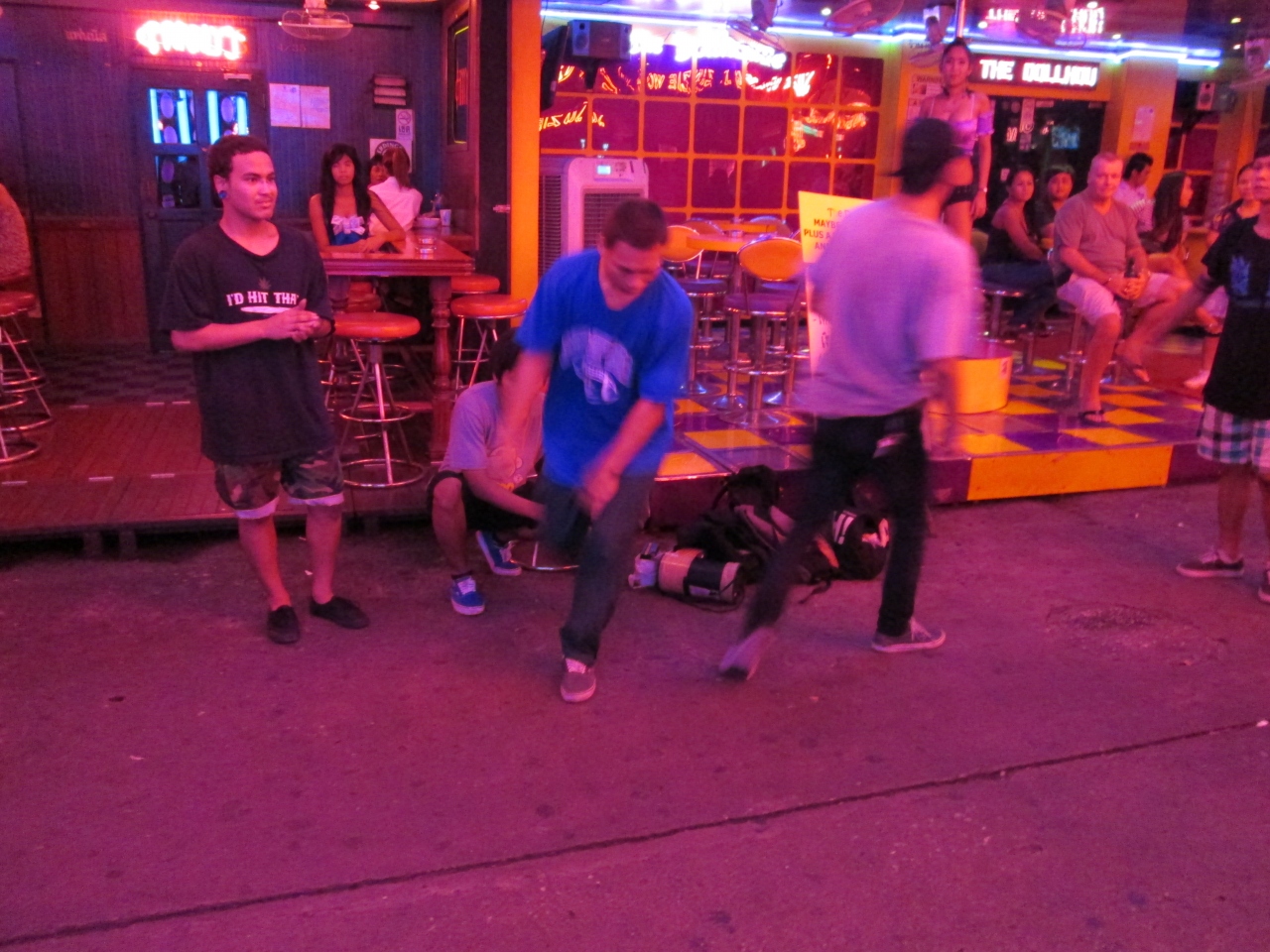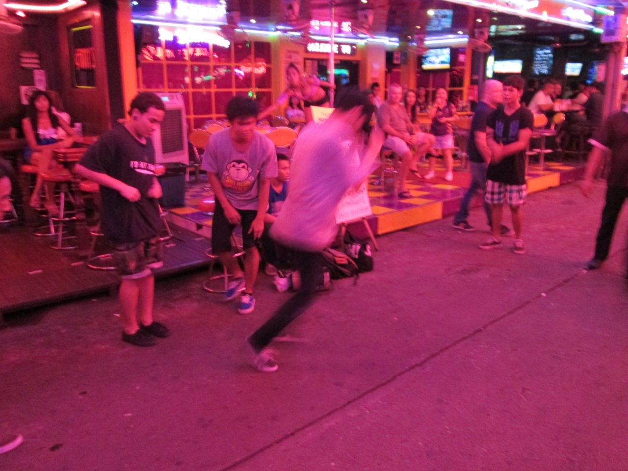 ここ数年はバンコクの治安はいたって良好です。女性でも暗い夜道でなければ一人歩きをしても十分に安全だと思います。深夜0時過ぎても写真のように街は明るくおもしろいパフォーマンスを行っています。平和な国です。