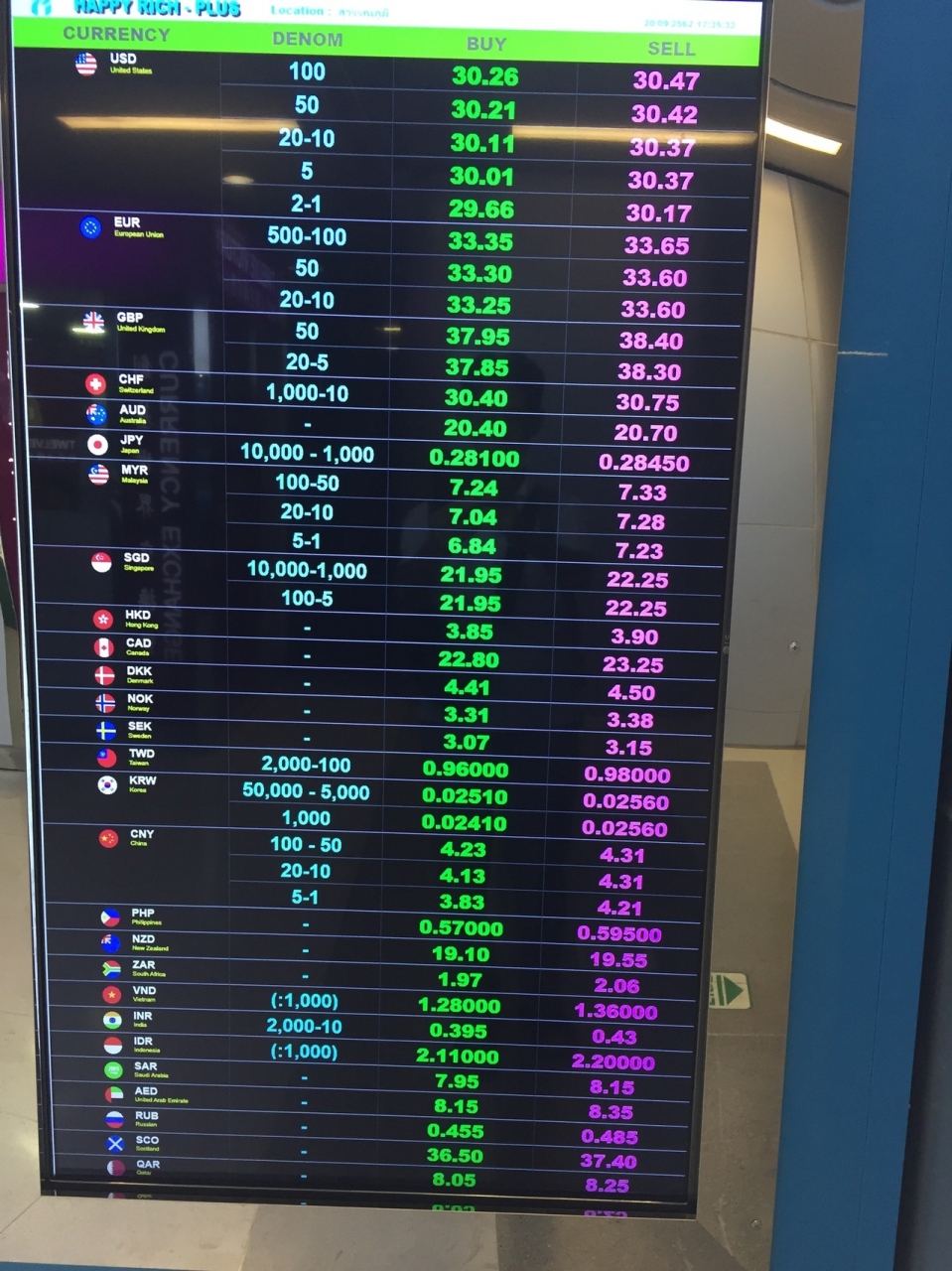 街中の両替レートは場所によってまちまち、バンコクの方がレートは良いみたいですが、それでもクレジットカードで請求されるレートより、街中でキャッシュtoキャッシュで両替したレートの方が、良いレートでした。クレジットカードのキャッシングも、試そうとしましたが、気を付けないといけないのは、「continue with conversion」と自国通貨建てで決済しますかという選択がでてきますが、必ず、without conversion を選択しないと、すごく悪いレートになってしまいます。