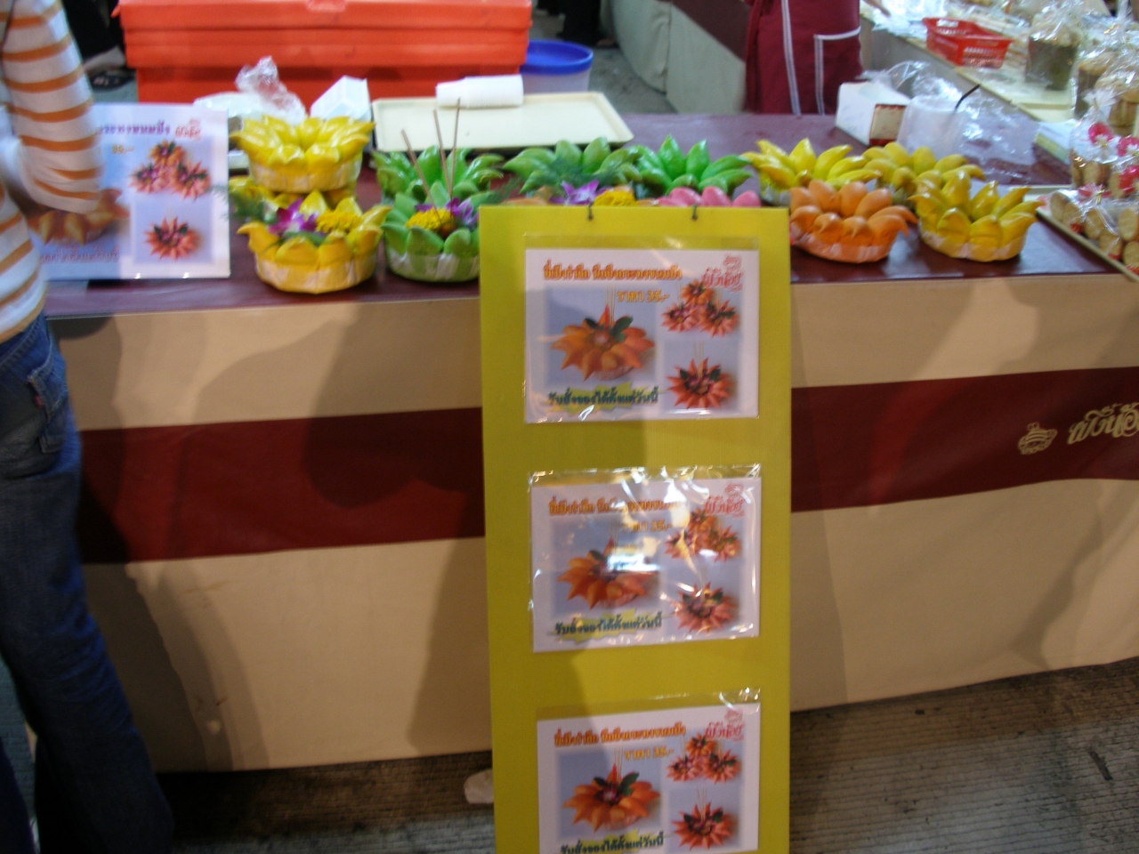 バナナの葉を切り色々な形にして回りなどを飾りその上から生花を生けていきます。ピンで留めるうら技を忘れてはいけないです・・