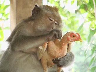 小さい時から同じ部屋で同じ餌で育てられてきた為・・猿としては自然なる愛情表現と言うわけです、それは猿は本来ノミ取りや虫を毛からとるためにする行為なんですが・・何しろ子供の頃からいつも1諸で成長しているので、兄弟と同じ・・と言う愛情で・・ついついニワトリを抱えてその羽から虫や汚れなどを取るうちに???羽も全部抜いてしまったと言うわけです。