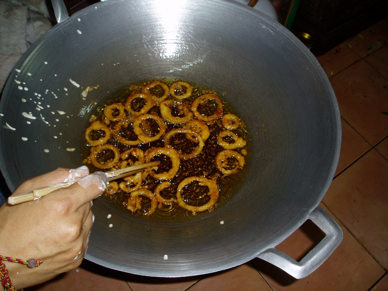 と笑われながら・・NNNNN・・・あれ?味があるしかも美味しいね、汁に付けて食べる天ぷらも美味しいけれど、これは何が入ってるの?それは企業秘密だからねえ・・でも基本は塩と辛しだけ後はお好みだから・・それで色が茶色なわけだ。そう・・タイ人はこのテの揚げ物にタレをつけるとしたら??海老のすり身のペーストから出来たナムチムとか、甘いタレなどを付けて食べているこれもおやつの代わりになるのだろうか?割と3時頃学校の帰りに売られていることが多い。子供が食べるだけではもったいないくらい美味しい! -